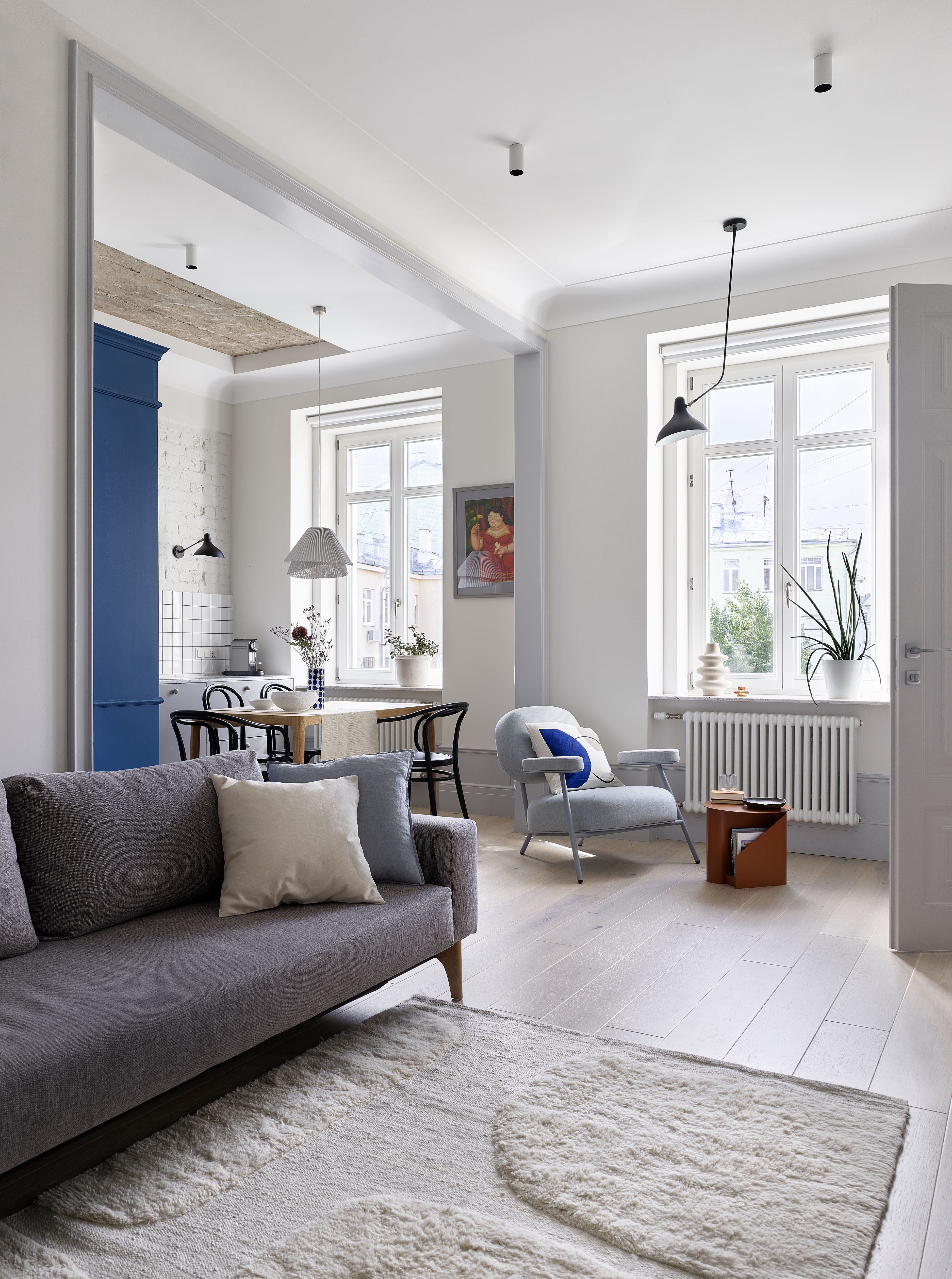 Этот проект – воплощение мечты сразу нескольких человек: Марии Катарьян и ее заказчиков. Супружеская пара мечтала поселиться в старом доме в центре Москвы, а Мария всегда хотела оформить интерьер в таком доме. Ремонт, сделанный в квартире в 1990-х, убил все исторические детали. “Я изучала старые интерьеры, смотрела, какие элементы характерны для начала XX века, но мне не хотелось делать стилизацию”, – говорит Катарьян. Она добавила атрибуты разных эпох, но в небольшом формате. Например, распашные двери в спальню, откуда просматриваются гостиная и кухня, – это аналог анфилады. А фрамуги в ванной будто остались в наследство от советских квартир.