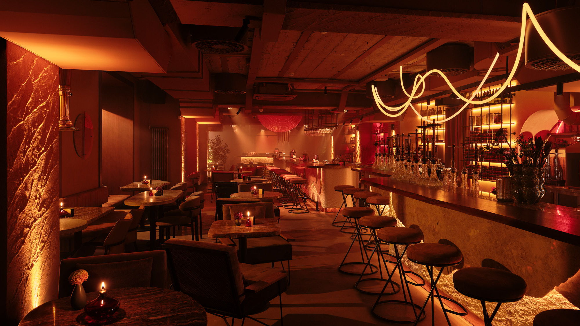 Каждая зона продумана как декорация для общения и отдыха. Панорамные окна заливают зал мягким светом, играющим на изысканных деталях — от геометричных орнаментов до минималистичных форм мебели. Центральная барная стойка выступает архитектурным акцентом и визуальной точкой притяжения, где отражения и свет создают ритм пространства.