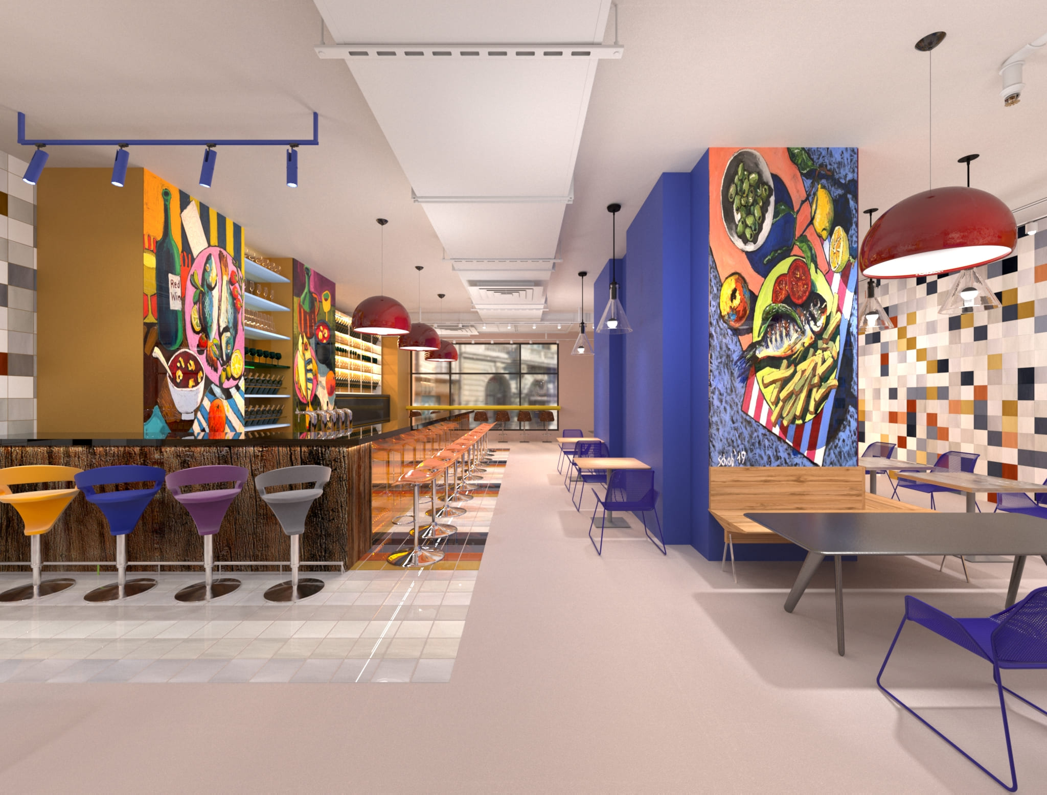 Главной концепцией проекта «Суп» является его цветовые решения, которые вдохновлены гаммами картин польского художника Дэвида Шэба. На мой взгляд, именно эти цвета задают общую атмосферу заведения. Пространство организованно таким образом, чтобы каждый посетитель мог найти для себя наиболее подходящий уголок по цветовому решению. Мебель в проекте имеет различное настроение, например, для баланса в некоторых зонах использованы металлические столы и деревянные скамейки, чтобы сохранить целостность композиции. Барные стулья же, наоборот, подчеркивают некоторую «забаву» и «беззаботность», будто отсылая посетителя в детство.