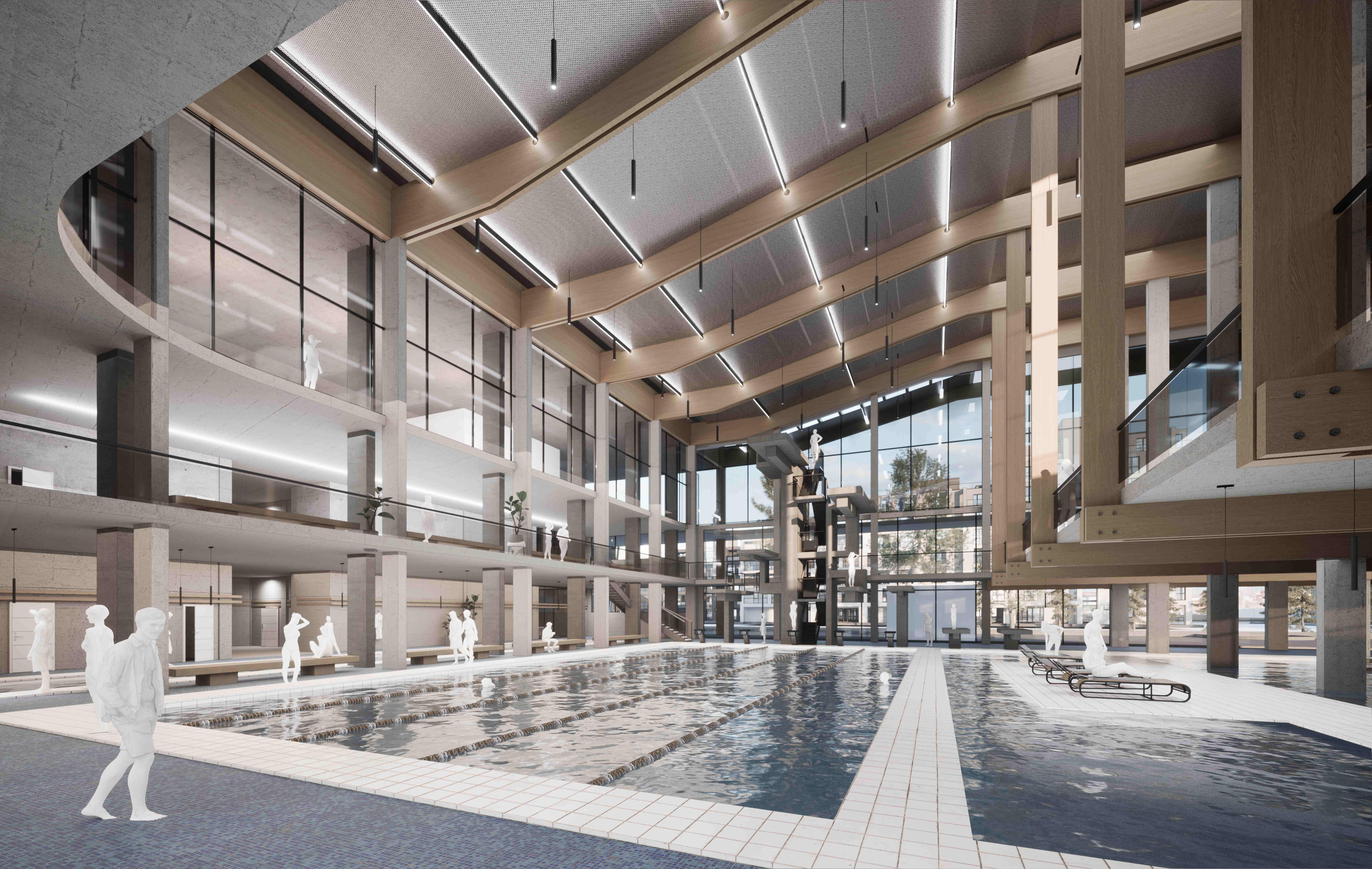 Проект спортивного комплекса в Калининском районе Санкт-Петербурга — это динамичное сочетание спорта, отдыха и общения в едином пространстве. Комплекс расположен на пересечении улиц Арсенальной и Ватутина на бывшей промышленной территории и участвует в формировании общественного пространства вместе с главным бульваром квартала и парком. Здание состоит из нескольких этажей, функционально разделённых атриумным пространством на зоны: бассейны, спортивные залы, спа-салон, кафе и салон красоты. В межэтажном пространстве над бассейном предусмотрена открытая спортивная площадка.