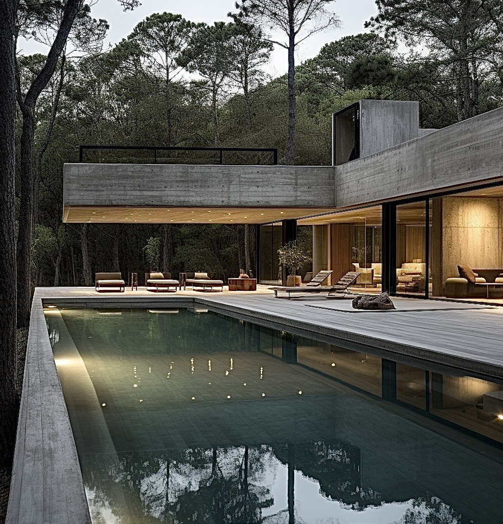 О проекте: Участок проектирования находится в лесу, и автору показалось уместным использовать в качестве основного материала бетон — чтобы подчеркнуть красоту окружающей природы, а также создать связь между внутренним и внешним пространством. Проект представляет собой вдохновляющий пример современной архитектуры, а построенная по нему вилла станет отличным местом для отдыха вдали от городской суеты.