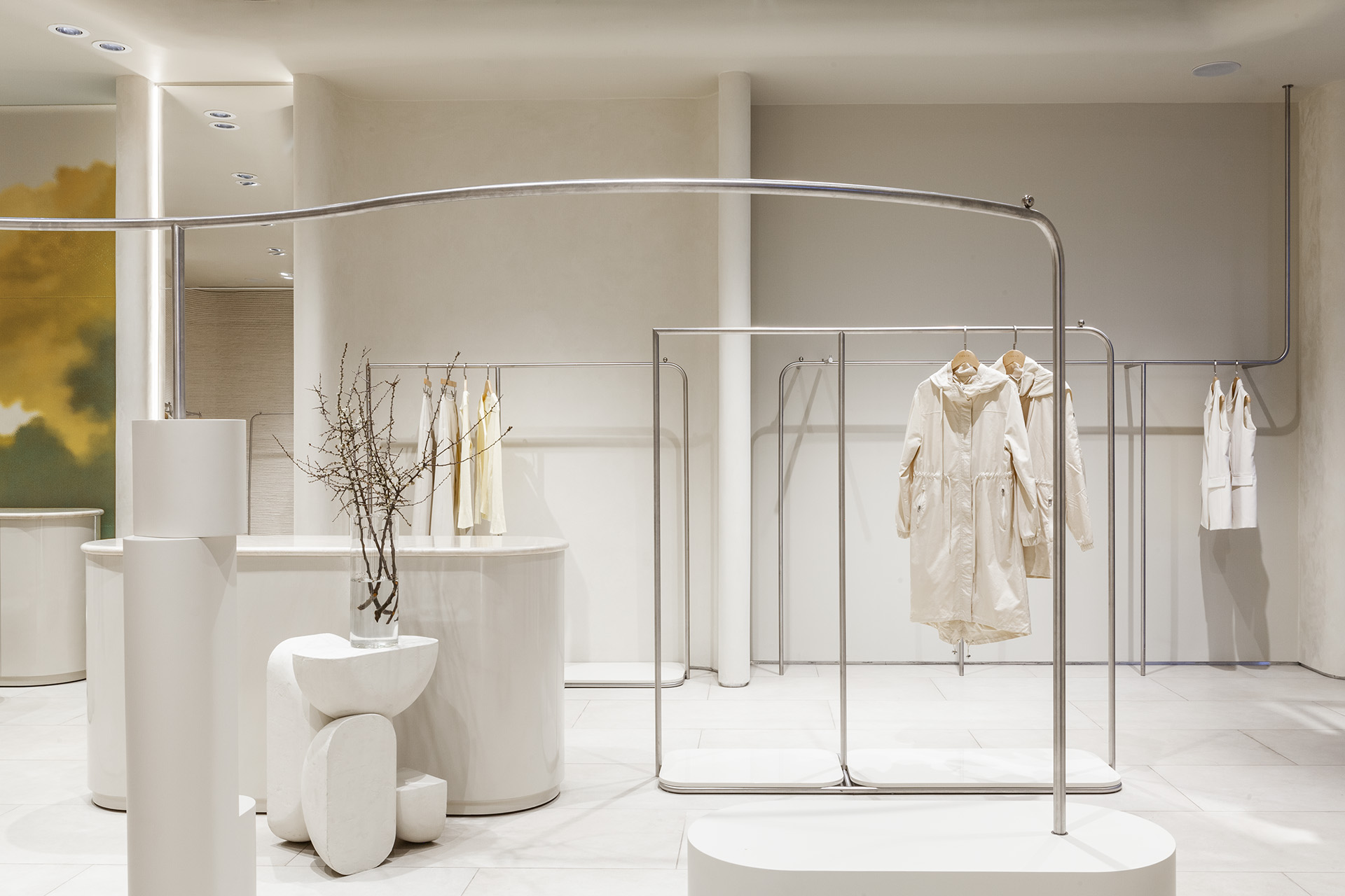 Описание проекта, предоставленное заявителем: Бренд CONSO ориентирован на женщин 20–50 лет, предпочитающих сдержанную моду. Интерьер должен был стать гармоничным фоном для одежды, отсылая к природе. Основная палитра — светло-песочные, зеленые и коричневые оттенки, а плавные формы смягчают пространство. Чтобы избежать излишней нейтральности, команда добавила скульптурные колонны у входа, изогнутые рейлы и зеркала с подсветкой, создающие интересную динамику.