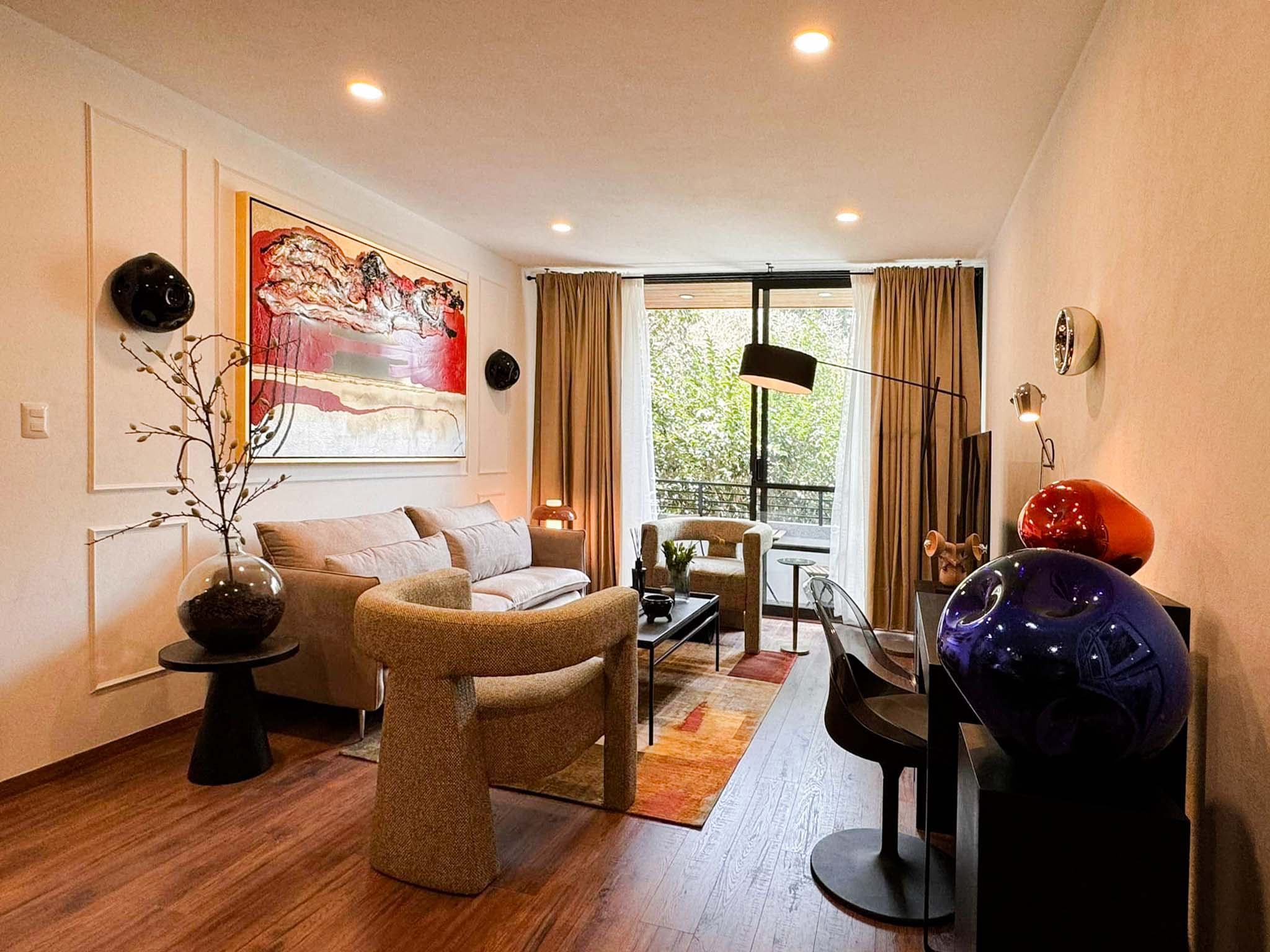 Описание проекта, предоставленное заявителем: Квартира Contemporary Mexica Apartment от Adrián Gómez Art и Kauslab органично сочетает доиспанское наследие с современным интерьерным дизайном, создавая пространство, где история и современная жизнь сосуществуют. Расположенная в Мехико, квартира украшена обоями по мотивам древних узоров Мексика, современной мебелью и скульптурными элементами, отражающими культурное наследие предков. Пузыри из выдувного стекла с местными минералами добавляют текстуру и цвет, а произведения искусства воспроизводят пейзажи, мифологию и священные символы. Натуральные материалы — камень, глина, дерево — гармонируют с геометрическими мотивами, изображениями священных животных и божеств, соединяя прошлое и настоящее. Смелые цвета — красный, охра и нефритово-зеленый — связывают жителей с землей и небом, напоминая о фресках и храмах. Каждый элемент превращается в портал к культурному и духовному наследию Месоамерики, делая квартиру иммерсивным, символичным и функциональным пространством, где эстетика, ритуал и повествование гармонично сливаются в современном жилье.