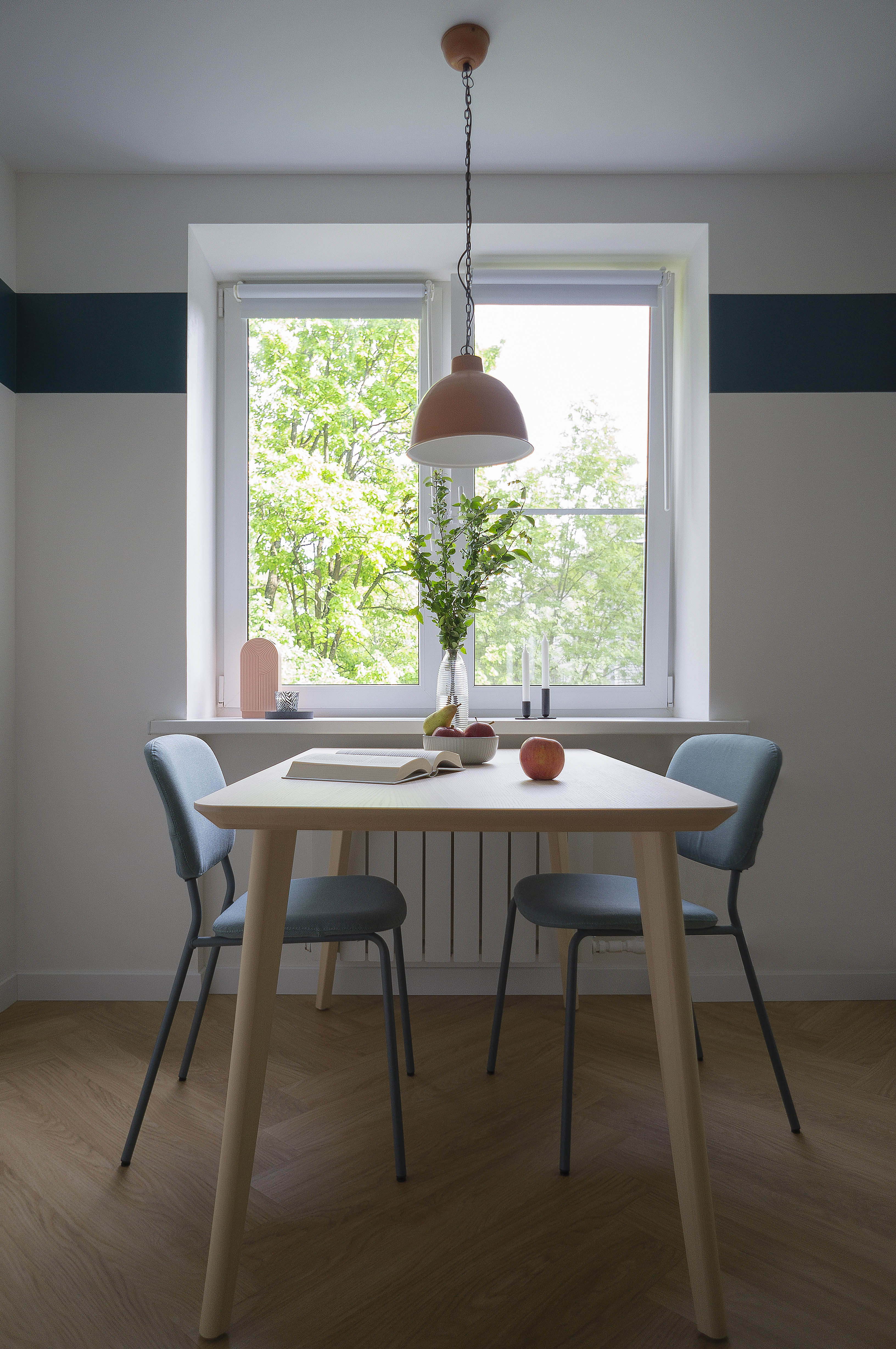 О проекте: Дизайн-проект двухкомнатной квартиры в Пушкине для молодой пары. Весь интерьер выполнен в светлых тонах с добавлением ярких акцентов, поэтому автор назвала проект "Контраст". Он отражает личности заказчиков: она - гид-переводчик, любит читать, ходить по музеям и выставкам, он - специалист в IT-сфере, любит баскетбол, всё технологичное. Они разные, но есть и то, что их объединяет, - любовь к путешествиям. В гостиной появляется оранжевый круг, напоминающий баскетбольный мяч, он находится в зоне рабочего места заказчика. В поддержку ему над обеденным столом расположен оранжевый светильник. Комнату разделяет книжный стеллаж, который включает в себя рабочее место заказчицы и ее книги. Между двумя рабочими зонами стоит диван - это место, где две противоположности встречаются. В цвет дивана была подобрана сине-зелёная полоса на стене, объединяющее всё пространство. Чтобы поддержать цвета интерьера, дизайнер нарисовала постеры, на которых изображены заказчики и их увлечения. Они находятся над диваном.