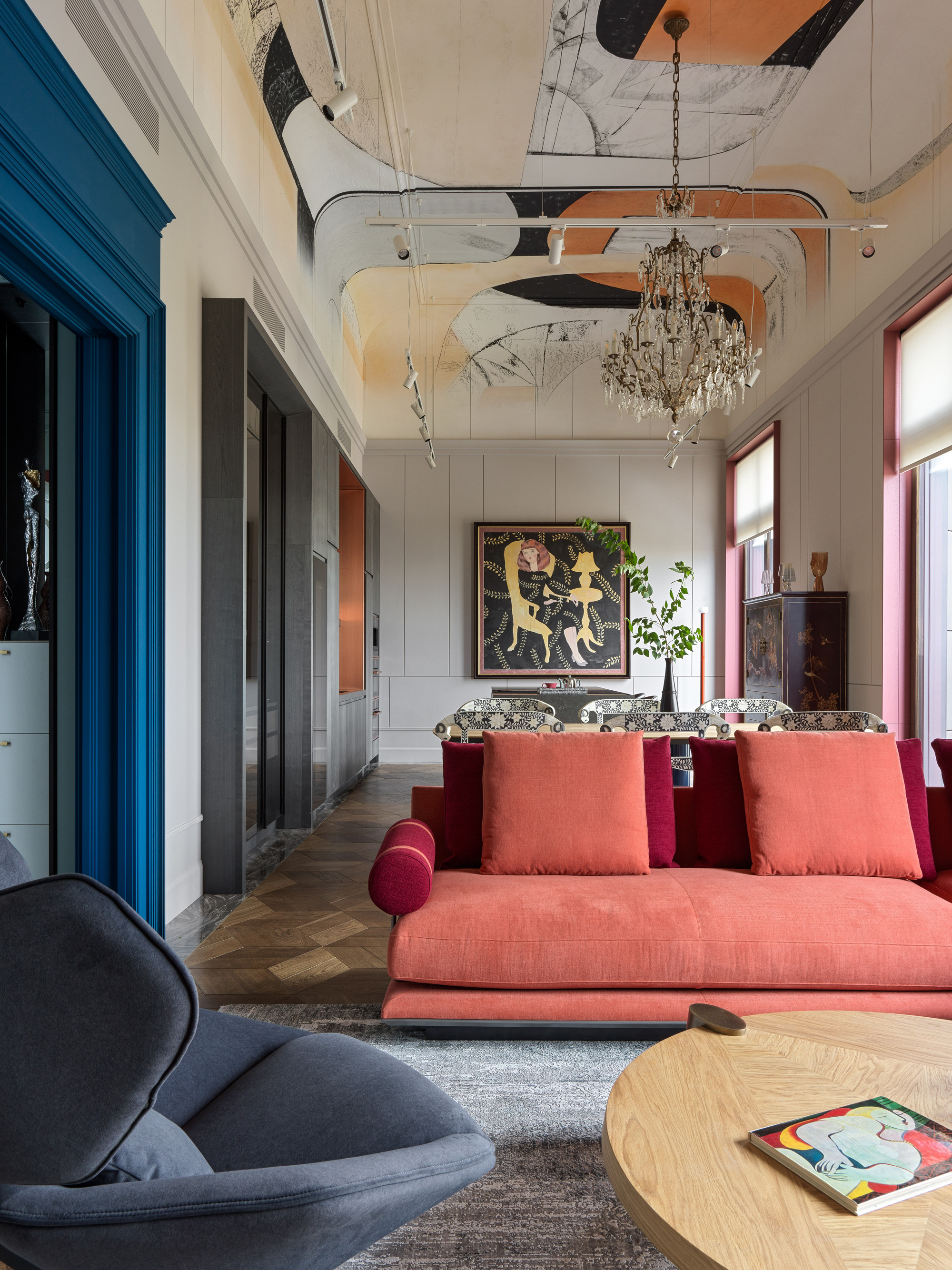 Яркий необычный дизайн пространства с авторскими росписями, инкрустированной мебелью и галерейной системой освещения отсылает к музейным залам расположенной по соседству Третьяковской галереи.
