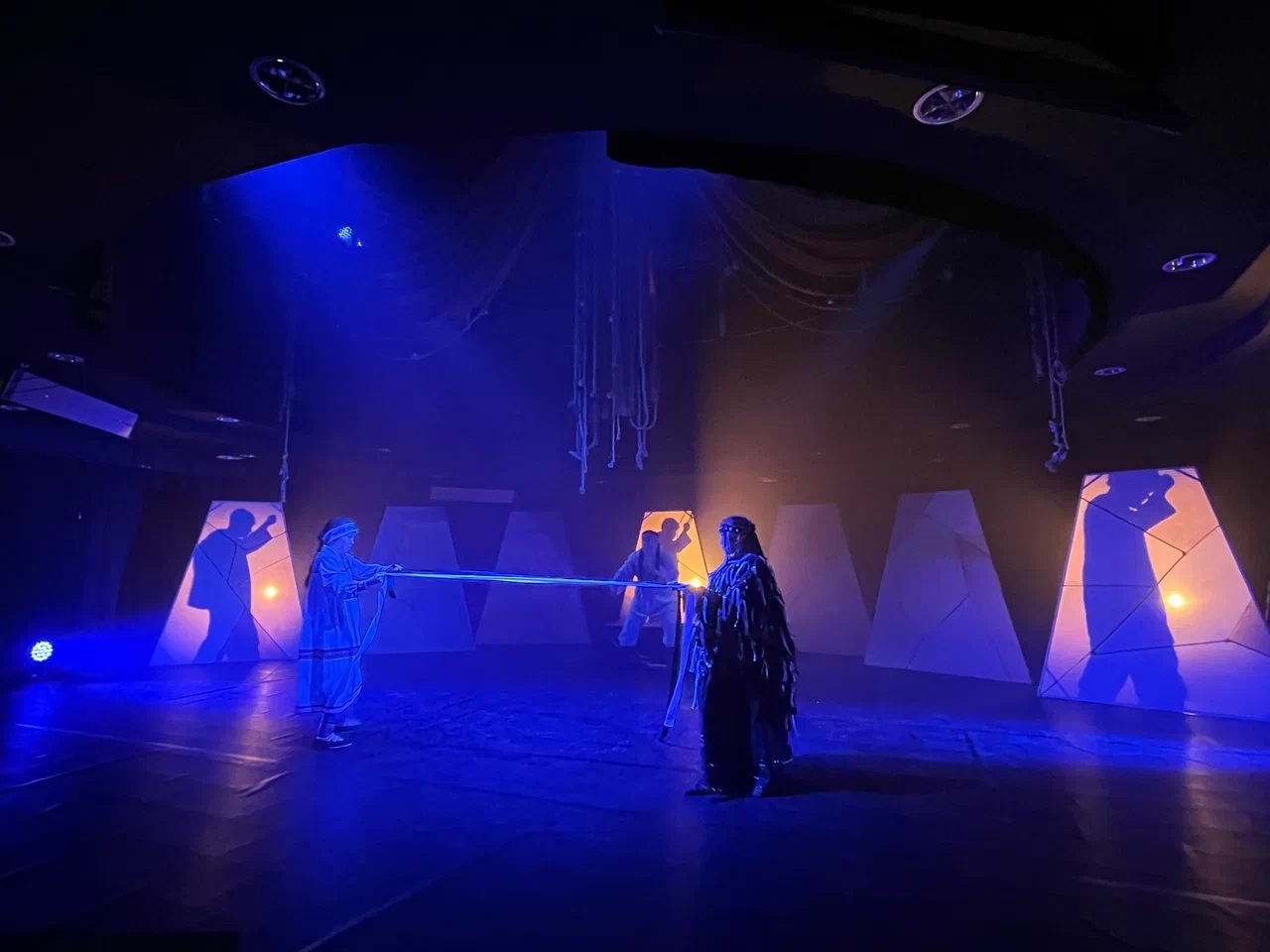 Чум – модель Среднего мира, где живут люди и животные. Легкие передвижные ширмы по периметру круглой сцены являют собой то чумы в поселении хантов, то горы природного ландшафта, то большой костер в момент жертвоприношения. Они то скрывают персонажей, то выявляют их силуэты.