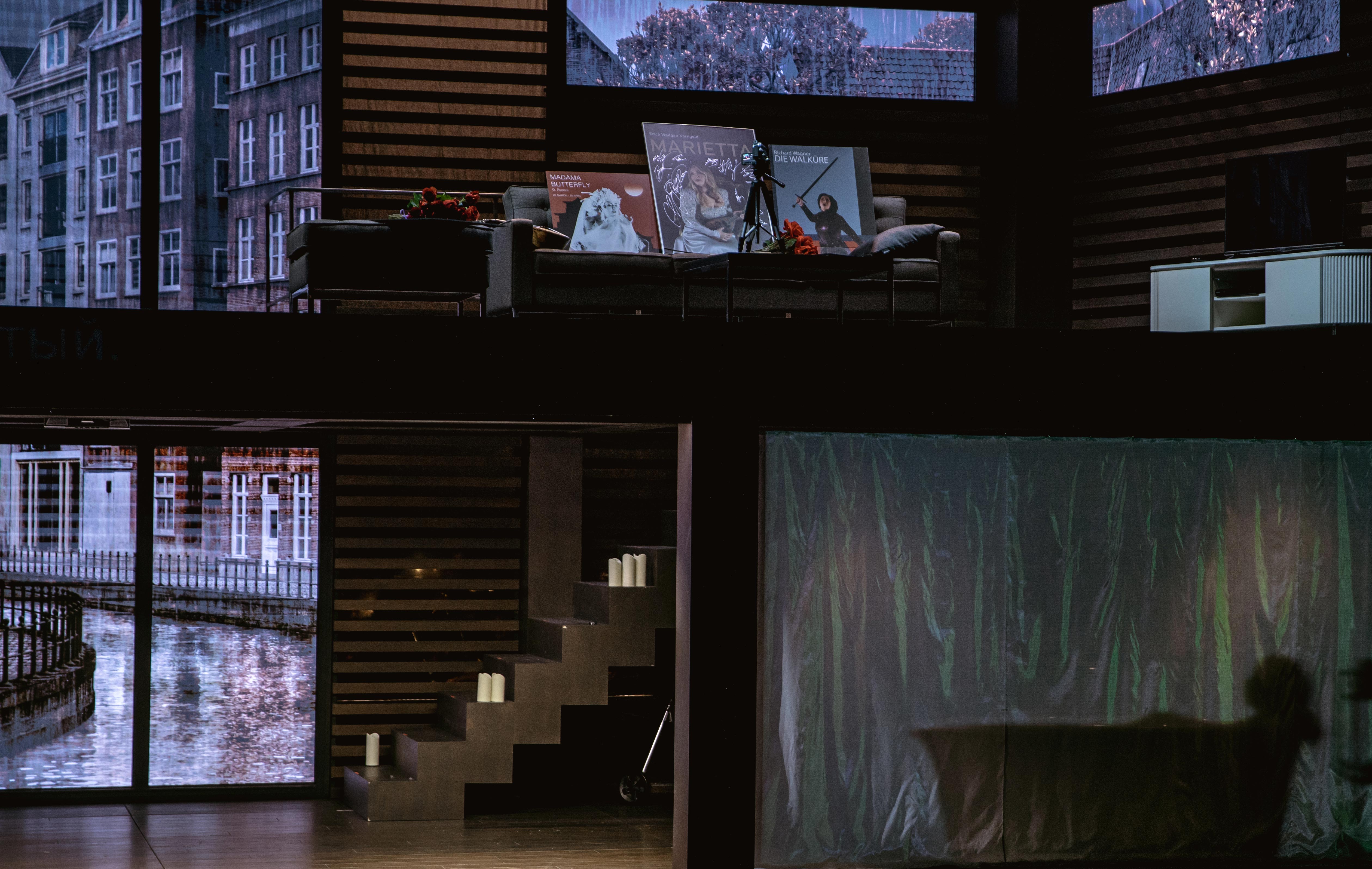 О проекте: Декорации к опере Э.В. Корнгольда "Мёртвый город" были созданы в виде двухуровневого павильона, спускающегося в оркестровую яму. Оркестр располагается за декорацией в арьерсцене.