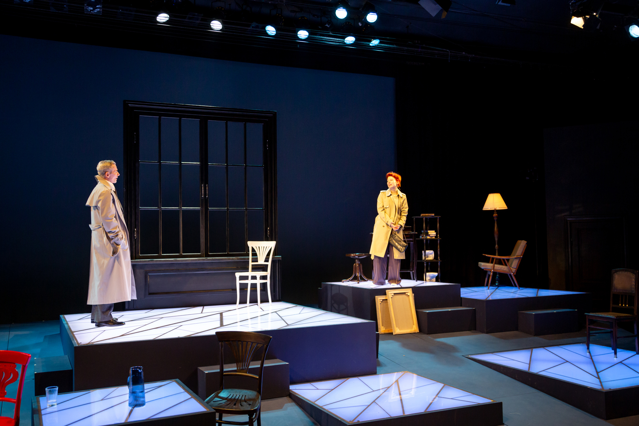 Решение пространства символичное. Хрупкий внутренний мир главной героини Хестер Коллер разбивается на части, как только ее бросает возлюбленный, которому она посвятила всю себя. Жизнь ломается и у других персонажей – у каждого по-своему. В сценографии, состоящей из нескольких площадок-подиумов на наклонном пандусе, покрытых трещинами, отражена неустроенность и неустойчивость. Кажется, эти «льдины» вот-вот рассыпятся окончательно… Они подсвечены то спокойным дневным светом, то холодным синим или леденящим белым, то огненно-красным или рыжим.