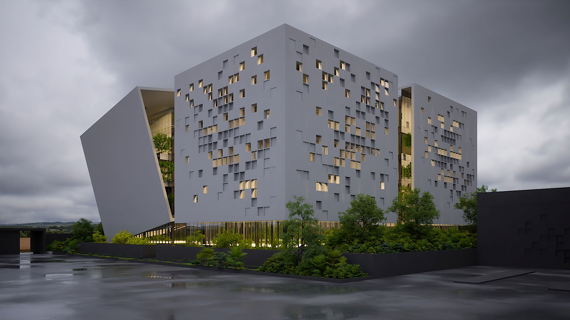 Дизайн офисного здания резко контрастирует со складскими помещениями. Оно имеет форму четырех кубов, разделенных небольшой зеленой зоной, и привлекает посетителей своей динамичностью. Планировка многофункционального комплекса предполагает различные функции для разных этажей. На первом этаже находятся двор, кафе, приемные и выставочные залы. На остальных этажах расположены развлекательные центры, офисные помещения, конференц-залы и даже отель со SPA-комплексом, тренажерным залом и несколькими ресторанами.