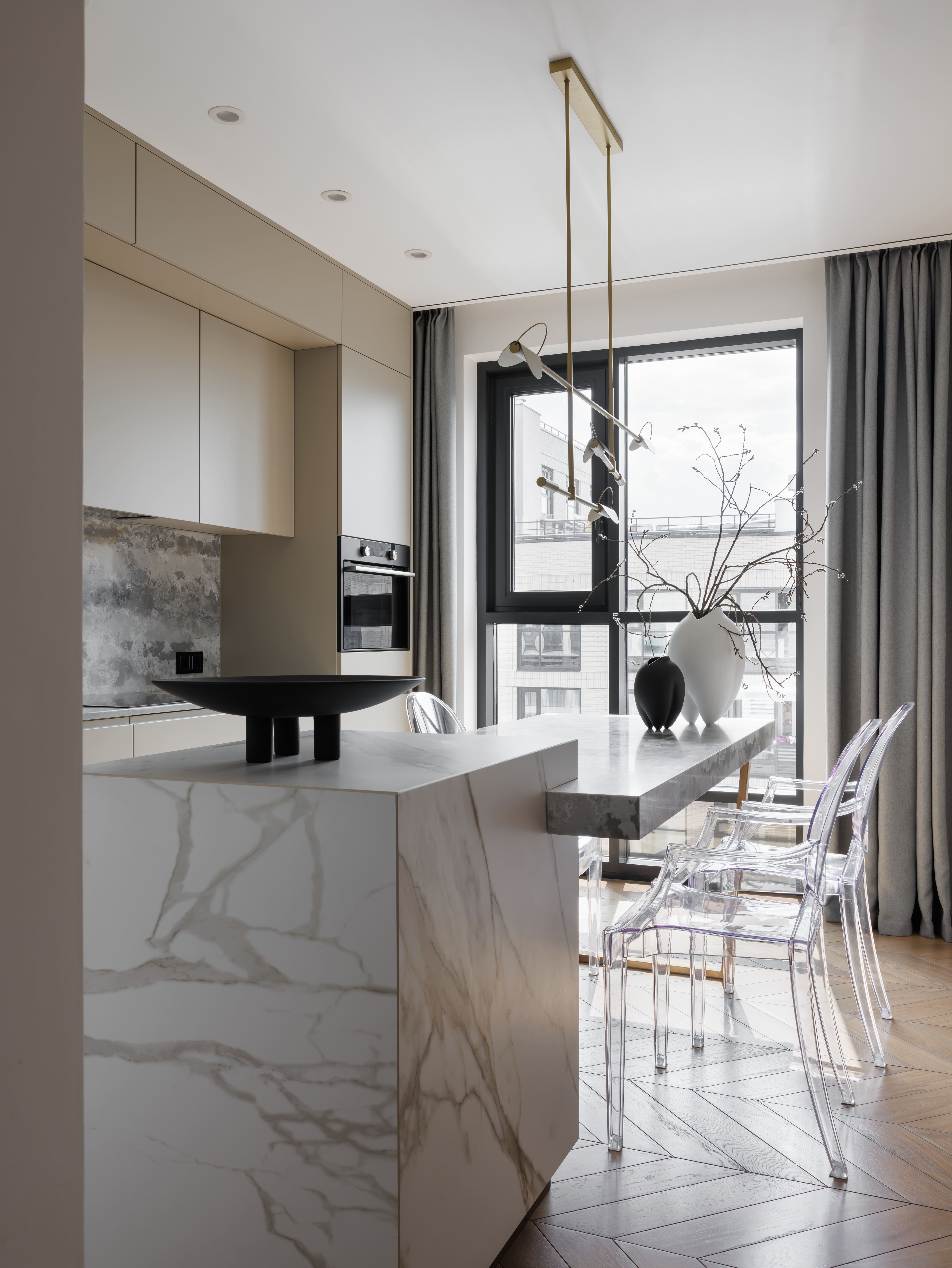 При проектировании кухни удалось добиться идеальной «арочной» симметрии. Сложное сочетание бежево-серого оттенка фасадов и дымчатого оттенка камня на фартуке и столешнице делает кухню одним из самых эффектных мест во всей квартире. Современный камин, интегрированный в мебельный каркас, является сердцем квартиры, объединяя и зонируя пространство. В спальне сделаны три функциональные зоны: зона сна, зона отдыха и гардеробная. Продуманная планировка, натуральные материалы и спокойные тона — все это формирует гармоничное пространство, максимально располагающее к отдыху.