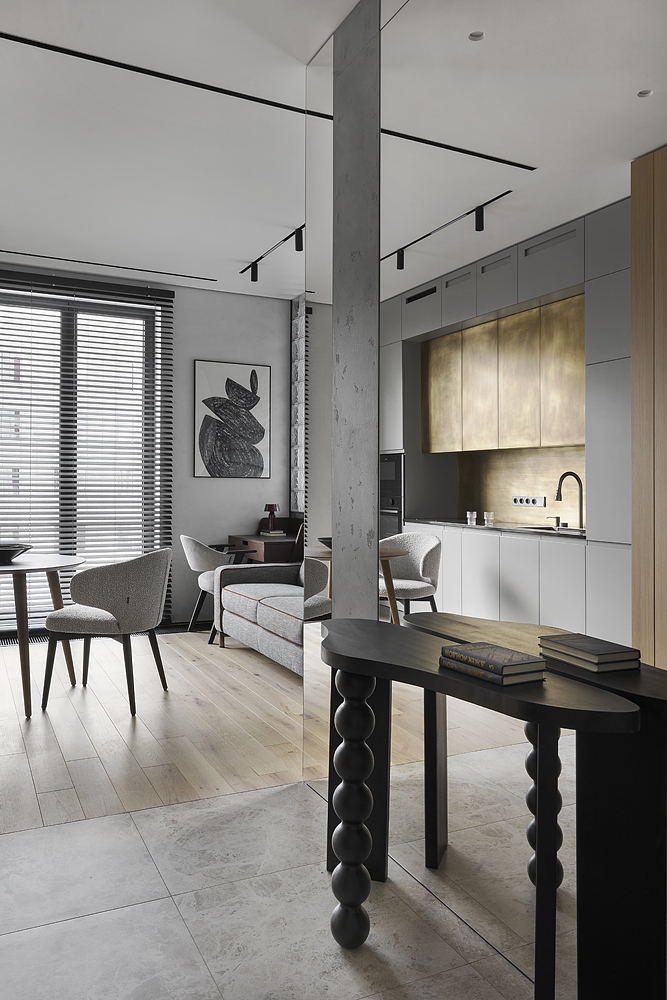 Кухонный гарнитур с латунным покрытием - «Швед мебель», обеденная группа - SK Design, диван - Natuzzi Italia. Белой дверью Invisible - компаниЯ Union.