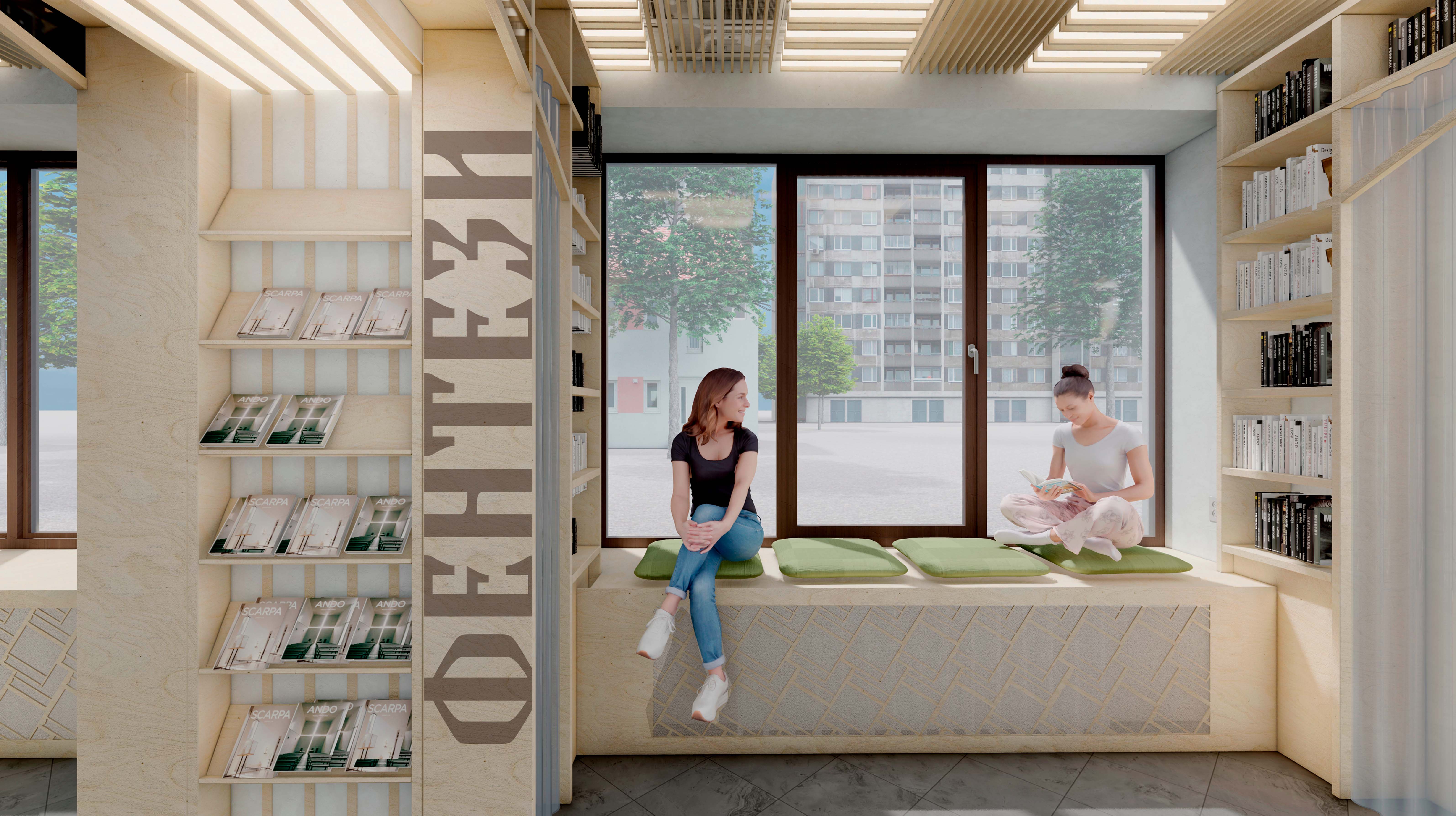 Каждый минус был обыгран как фишка проекта: коридорное помещение превращено в ряд анфилады, которая обеспечивает четкое разделение на разделы и создает места для уединения в небольшом пространстве; помещения под ЛК переоборудованы в стойки библиотекарей, позволяющие вести обзор на два зала. Большое внимание было уделено зонированию, чтобы обеспечить логистику и разделить офисную зону с общественной, акцентировать внимание на краеведческой деятельности библиотеки и заложить возможности расширения библиотечного фонда.