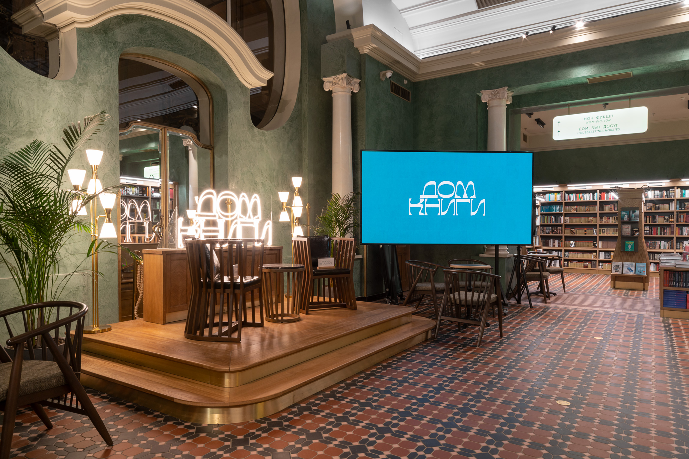 Новый старый Дом книги снова вернулся в город. В Санкт-Петербурге в ноябре 2022 года в предельно сжатые сроки был перезапущен легендарный книжный магазин на Невском проспекте. В тщательно отреставрированных стенах (конечно, здесь речь идёт не только о стенах, но и об исторических полах, потолках, порталах, люстрах, бра, облицовке натуральным камнем и пр.) необходимо было создать исключительно новое, драйвовое настроение большого мегаполиса, оставаясь при этом изысканным, элегантным, вступая на равных в диалог с творением Сюзора. Благородный шпон дуба, оттененный латунью, различного типа стеллажи, шкафы, прилавки, сцены - все это сформировало новое жизненное пульсирующее пространство, синхронизированное с жизнью города.