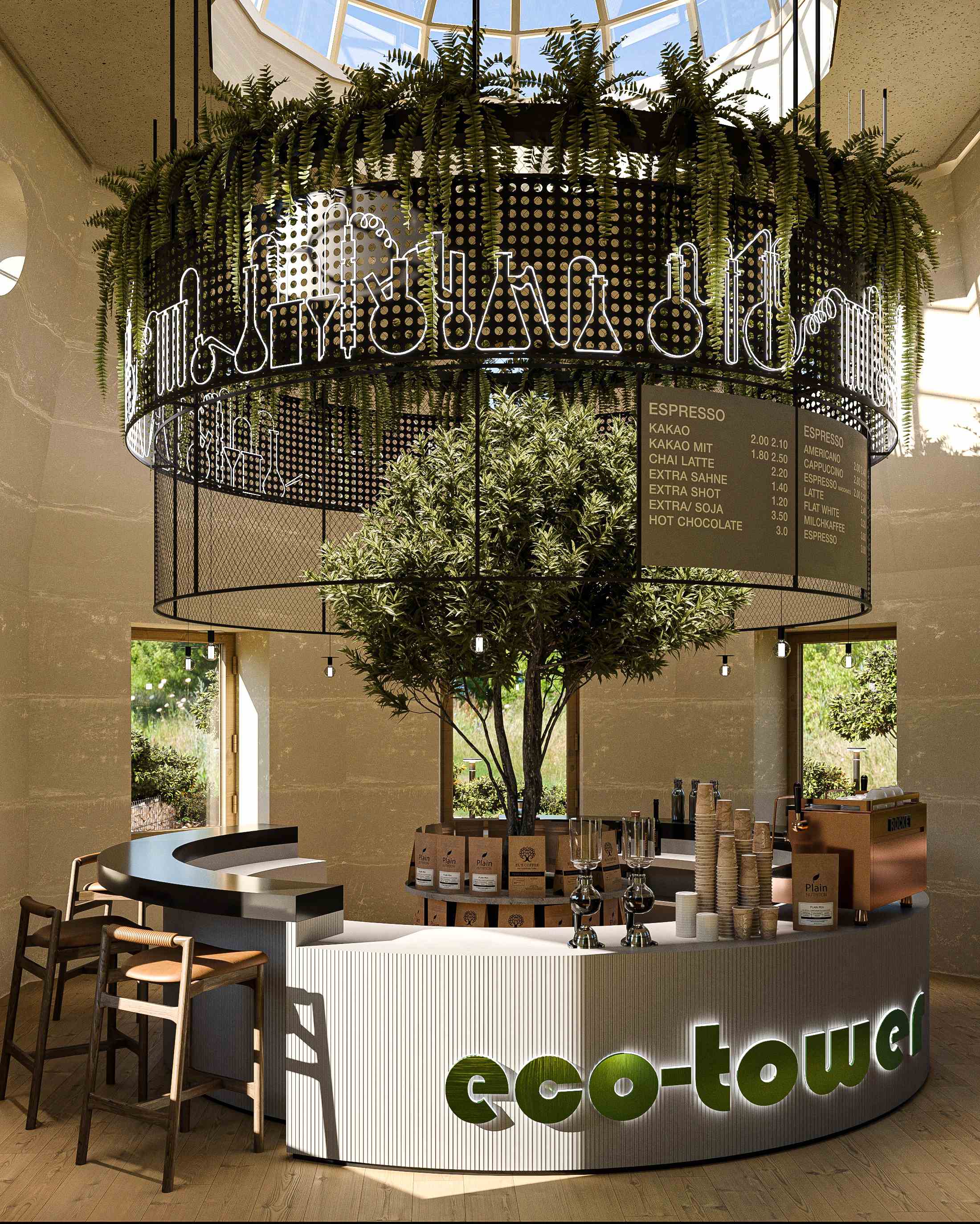 Описание проекта, предоставленное заявителем: Дизайн-проект представляет собой концепцию летнего кафе «Eco-Tower», расположенного в Приоратском парке. Источником вдохновения для архитектуры павильона стала расположенная поблизости водонапорная башня — объект культурного наследия. Концепция средневековой крепости (послужившая основой для Приоратского дворца), а точнее её стилизованная и переработанная версия, отразилась в генплане сооружения. Цель проекта — создание небольшой точки общепита, способной удовлетворить потребности посетителей парка в кофе и закусках, а также предоставить место для отдыха и общения. В проекте сделан упор на экологичность: основными строительными материалами стали землебитные блоки и дерево, а обильное озеленение внутренних и внешних пространств создаёт приятную и умиротворяющую атмосферу, органично вписанную в эстетику окружающего парка. Кроме того, внутреннее пространство павильона наполняется светом и воздухом благодаря стеклянному куполу на крыше, который «ловит» солнечные лучи.