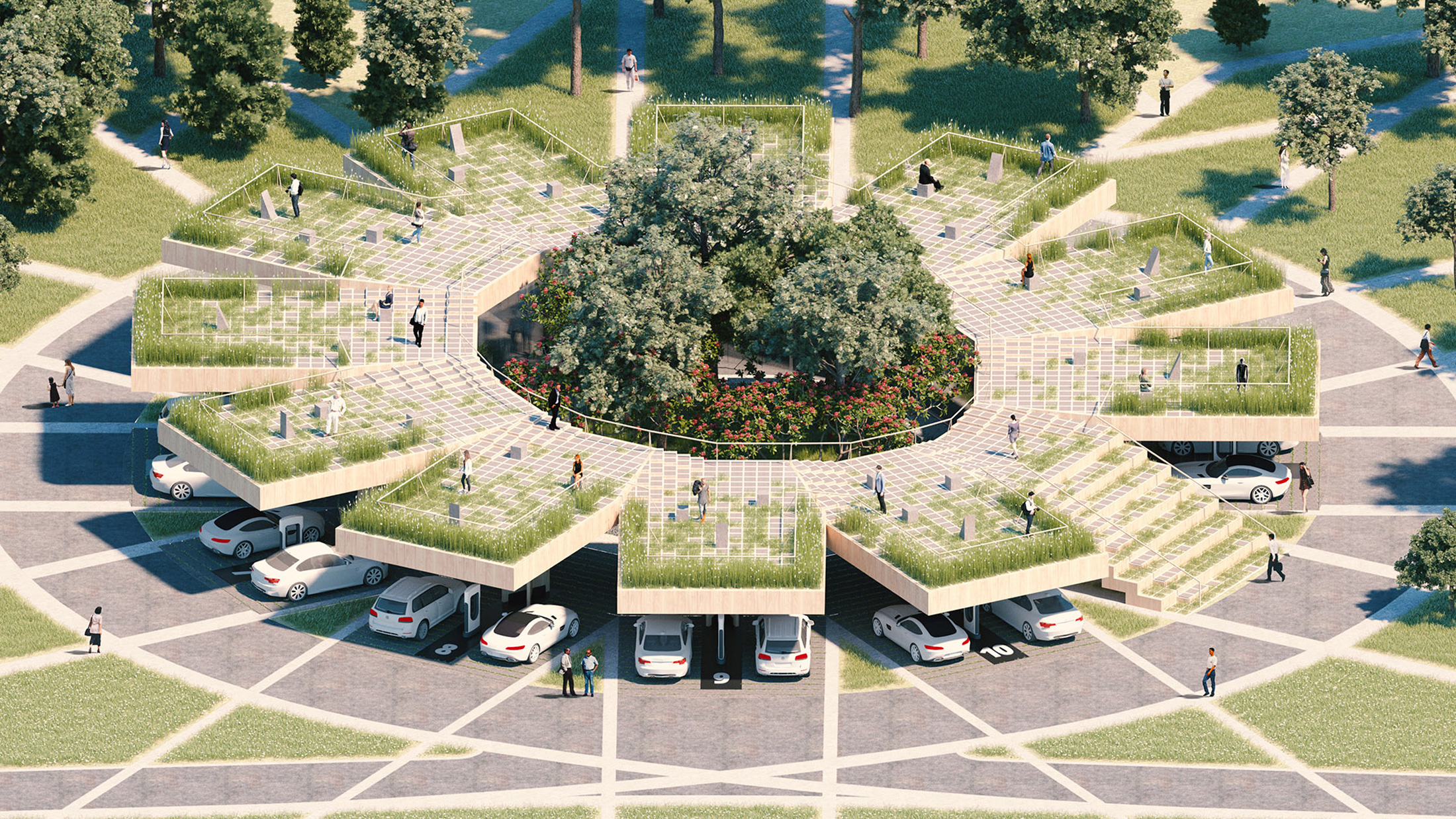 Описание проекта (предоставленное заявителем): eCone — это электрическая заправочная станция будущего, объединяющая чистую энергию, модульность и социальное взаимодействие. Благодаря навесу из клееного бруса, вдохновленному формой цветка ромашки, eCone обеспечивает компактное, но эффективное пространство для зарядки 22 электромобилей. Модули обеспечивают адаптацию станции в зависимости от местоположения и потребностей. Крыша постройки оборудована солнечными панелями и системой сбора ливневых стоков, а встроенные отопительные приборы растапливают снег. В центре станции обустроен внутренний дворик с кафе, коммерческими помещениями и местами для работы.