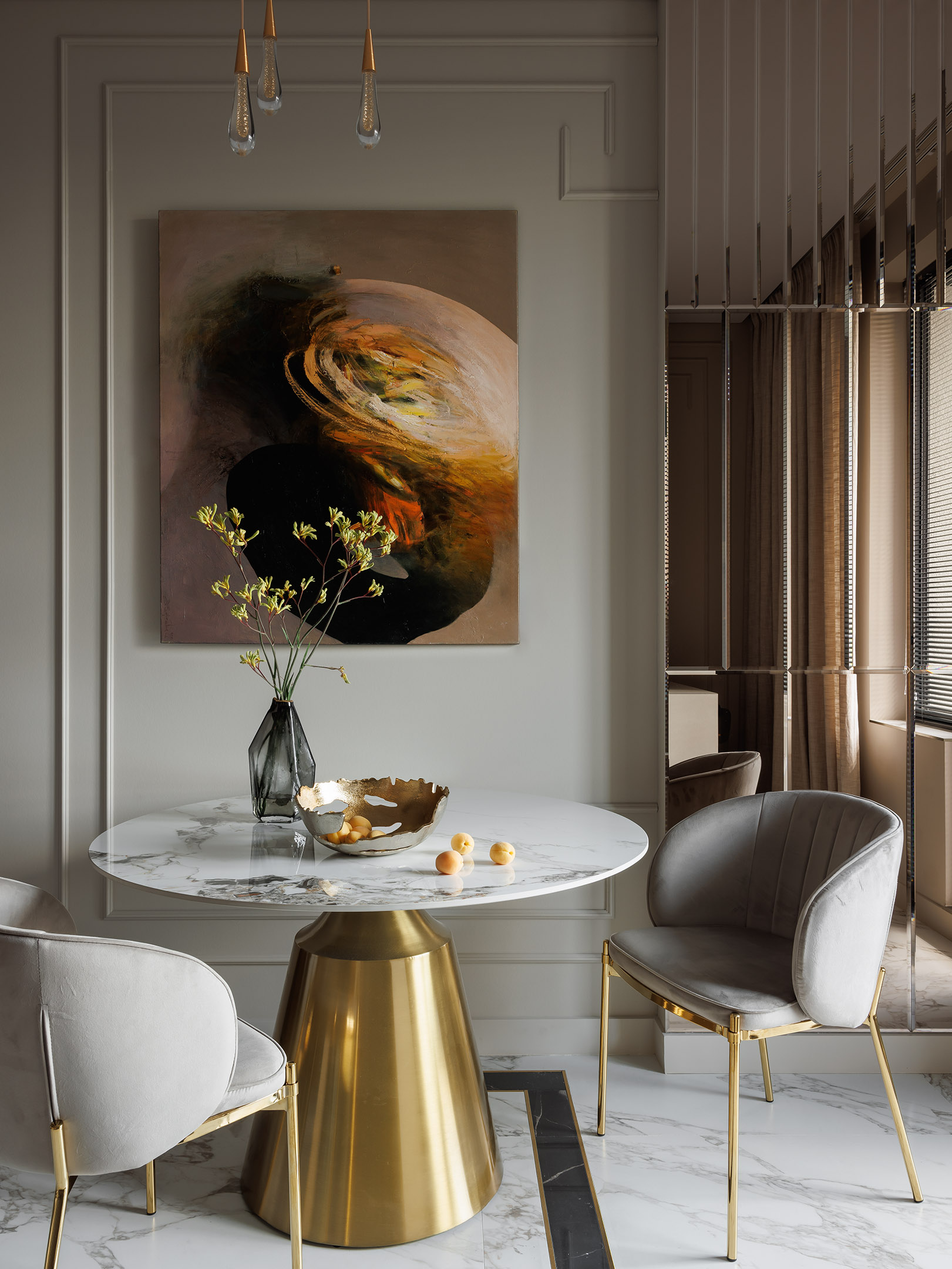 Заказчик – молодой, успешный человек, ценящий комфорт и эстетику. Его запрос – создать пространство, наполненное теплом натуральных материалов: дерева, золота и стекла, в спокойных, природных оттенках. Изначальная планировка квартиры представляла собой стандартное решение с узким коридором и ограниченным доступом естественного света. Но благодаря грамотной перепланировке удалось создать эффект расширения пространства.