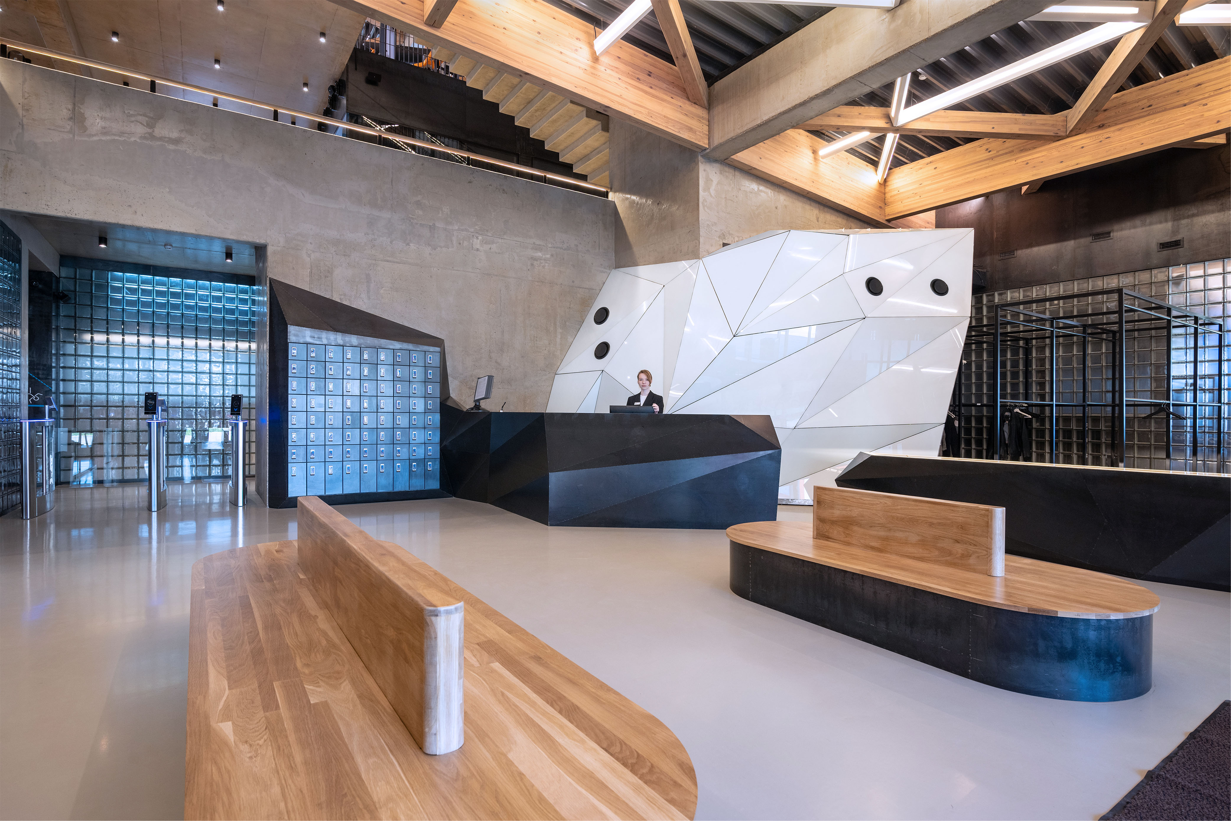 Работа над концепцией здания фитнес-клуба началась в 2016 году в консорциуме DK architects и Kremnev atelier. Совместными усилиями в 2017 году был разработан проект АГР. Все дальнейшие этапы проектирования выполнялись студией Kremnev atelier самостоятельно. Изначально все было продумано таким образом, чтобы архитектура и инженерные коммуникации стали частью интерьера и его выразительными деталями. Внутри мы видим деревянные клееные балки скатных крыш, которые играют важную роль в формировании образа интерьера, бетонный каркас и светопрозрачные конструкции стен из стеклоблоков. Цветовая гамма стремится к монохромности и единству используемых материалов. В интерьере в основном использованы серый, белый, черный. Эту палитру смело разбавляет натуральное теплое дерево.