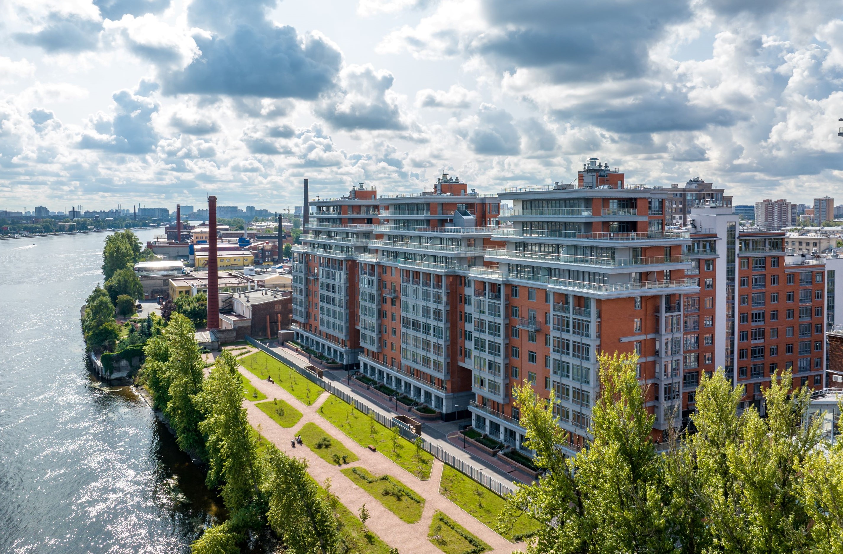 Речной фасад формируют 12-этажные секции. Квартиры, расположенные на верхних этажах, имеют открытые видовые террасы со стеклянным ограждением.