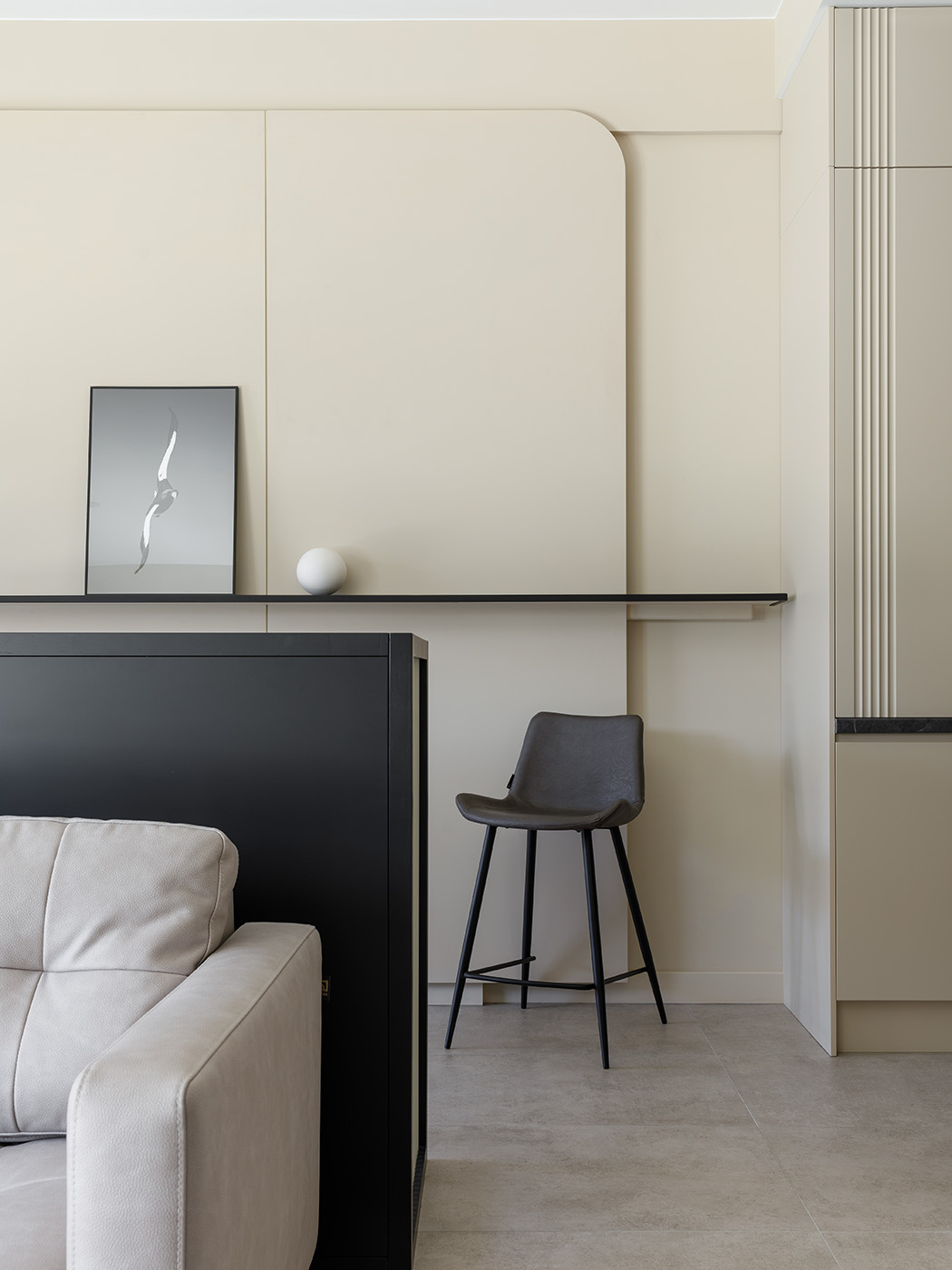 Вдохновением для создания проекта гостевых апартаментов в курортном комплексе "Первая Линия" стали живописный берег залива с его песчаными дюнами и фотоработы Евгения Доманова «Полет орла» (Япония, Хоккайдо) и серия «Японские журавли» (Япония, Хоккайдо), которая в 2020 году стала обладателем шести престижных международных фотопремий. Дизайнеры единодушно сошлись с заказчицей во мнении сделать проект легким, воздушным, в мягких природных оттенках с использованием натуральных материалов, что поддержит идею экопроекта и отдыха на курортном побережье. Спальную зону отделили от гостиной легкой перегородкой в японском стиле. Камин украсили фантазийным природным шедевром - мрамором Paranoia, каждый слэб которого неповторим и подобен произведению искусства. Достаточно массивную мебель удалось «растворить» в монохромном интерьере за счет использования единого цвета фасадов мебели и стен, что позволило акцентировать внимание на черно-белых фотографиях и прекрасном виде из окон на Финский залив.
