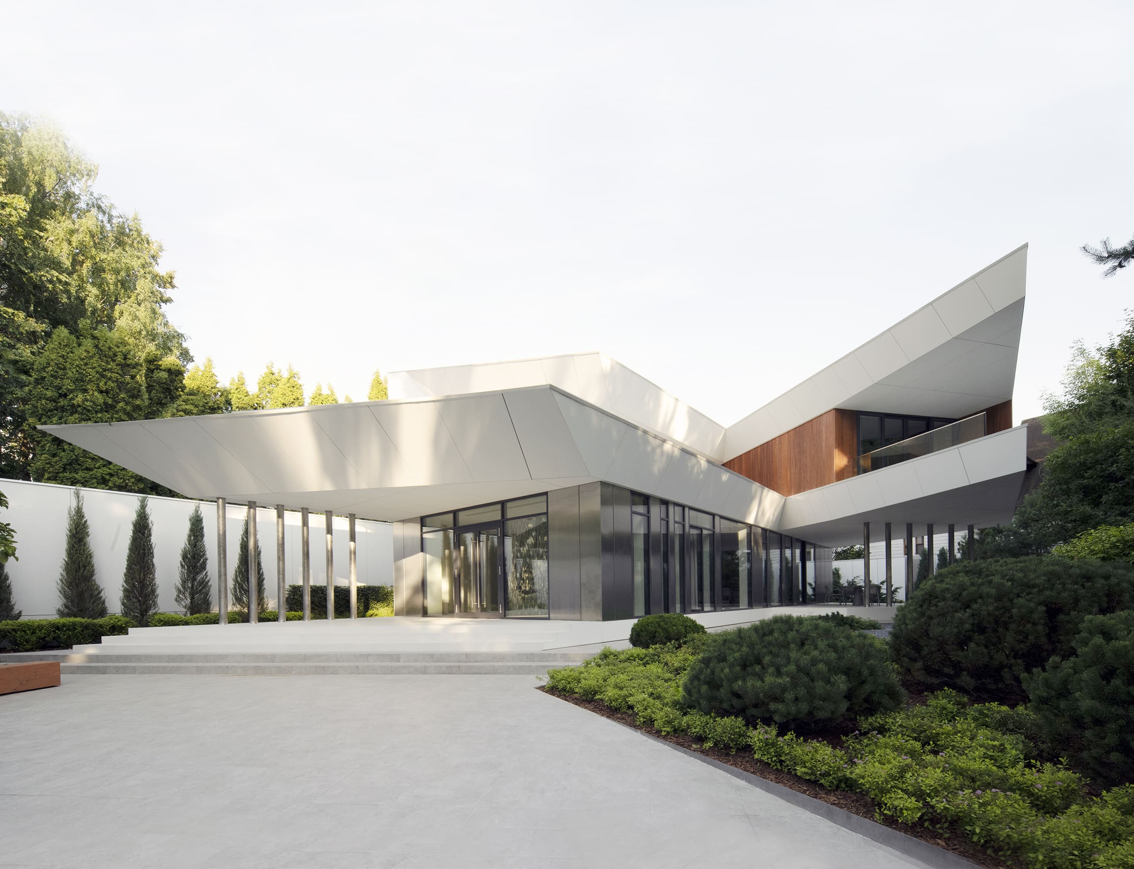Первый этаж визуально проницаем и открыт, в отделке фасада используются стекло и сатинированная нержавеющая сталь, позволяющие растворить его в окружающем ландшафте и наполнить отраженным светом сад. Второй этаж смещен и повернут относительно первого, это позволило обеспечить лучшую освещенность северной части участка, увеличить площадь дома, не загромождая территорию вокруг, и создать защищенную от осадков террасу. Для создания эффекта легкости и невесомости несущие колонны были выполнены из нержавеющей стали и интегрированы в плоскость монолитной плиты второго этажа. Благодаря этому объем второго этажа как бы парит над участком.