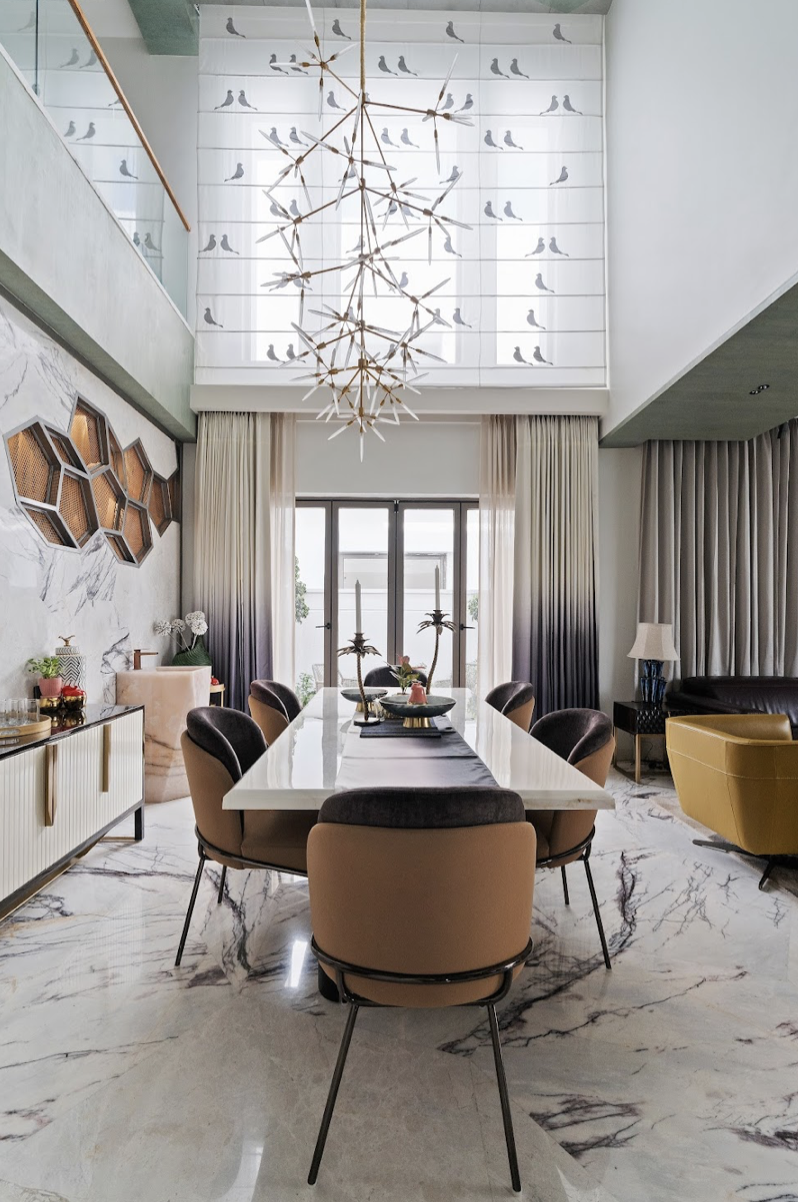 Пол в холле у входной двери выложен мрамором с красивыми сиреневыми и фиолетовыми прожилками. Этот же узор повторяется на перегородке, отделяющей гостиную от остальных помещений дома. Сквозь окошки-соты в перегородке видна оригинальная люстра, которая висит в обеденной зоне с двойным светом, создавая безмятежную атмосферу.
