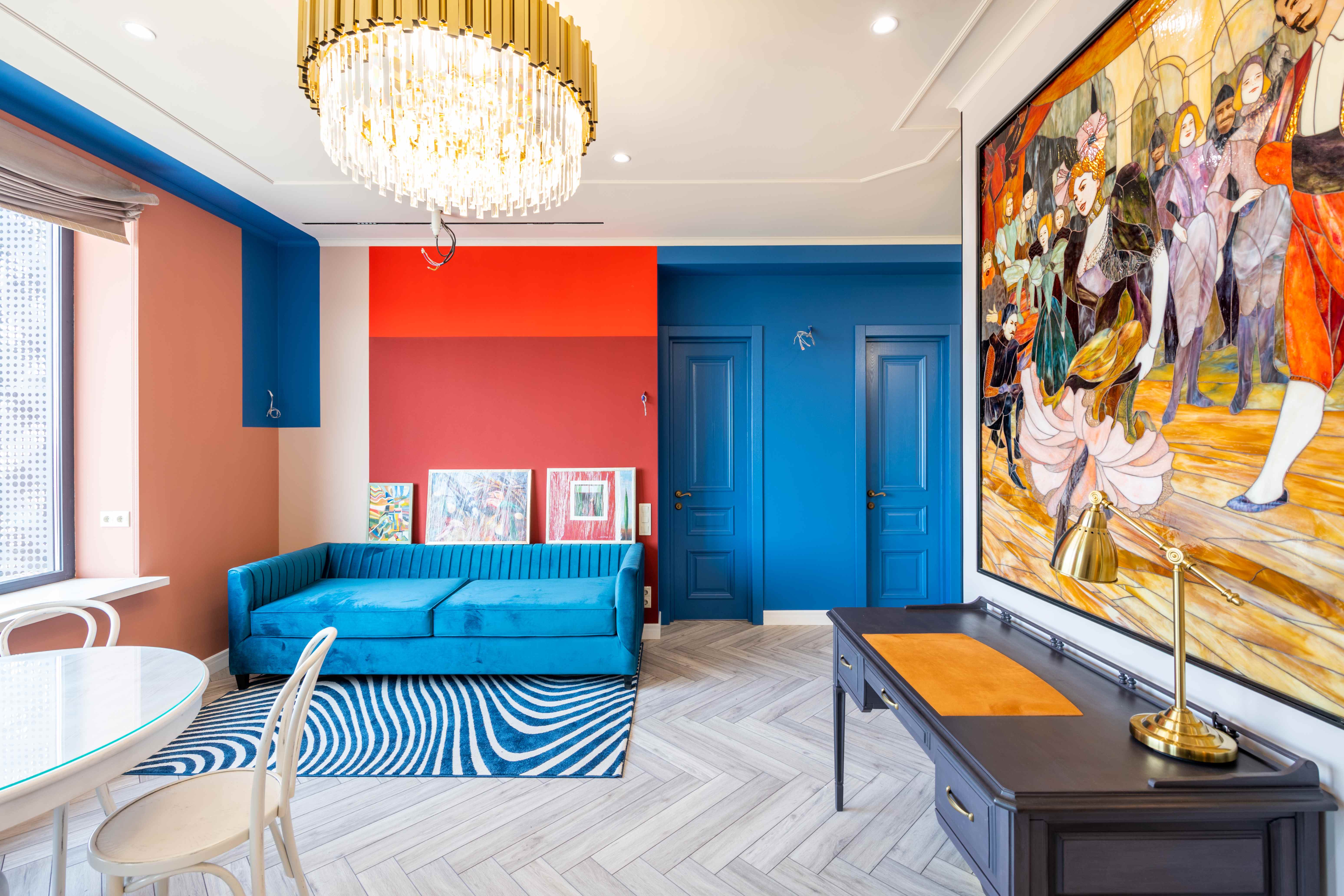 Описание проекта, предоставленное заявителем: Современный интерьер в стиле ар-деко, в котором много ярких красок, орнаментов, сочетаний материалов и даже есть мозаика.