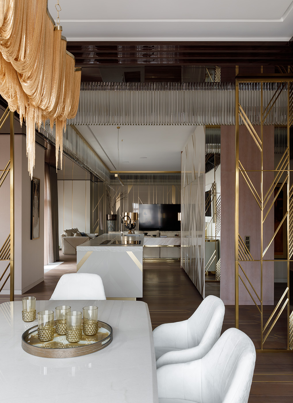 Интерьер апартаментов площадью 220 кв. м реализован в современном стиле с элементами ар-деко.