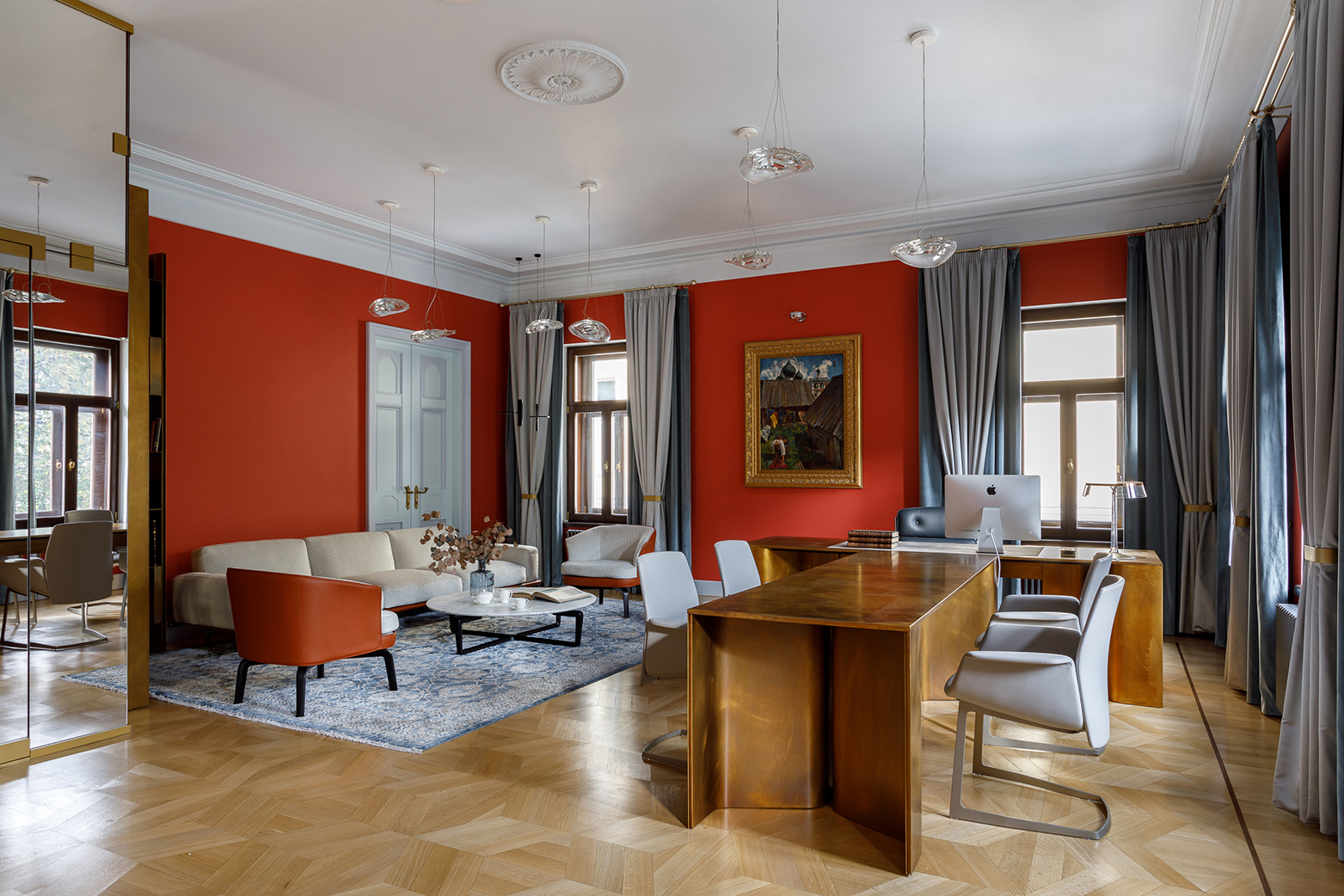 О проекте: Прежде чем приступить к проектированию, бюро изучало исторические архивы и справки. Владение постепенно сложилось в конце 18 века. В советское время городская усадьба князей Гагариных-Кувшинникова-Поповой была национализирована. Фасады здания сохранили композицию, восходящую к эпохе классицизма, но то, что было внутри, было практически безвозвратно утрачено. Особняк до начала работ находился в плачевном состоянии, и мастера скрупулёзно восстанавливали исторические дубовые полы, двери, реставрировали гипсовую лепнину. Сохранили и воссоздали историческую архитектуру помещений и придали ей современную функцию офиса. Ярким и нестандартным решением было не реставрировать анфиладу: стены здесь просто расчищены до изначального покрытия и законсервированы от разрушения музейным стеклом.