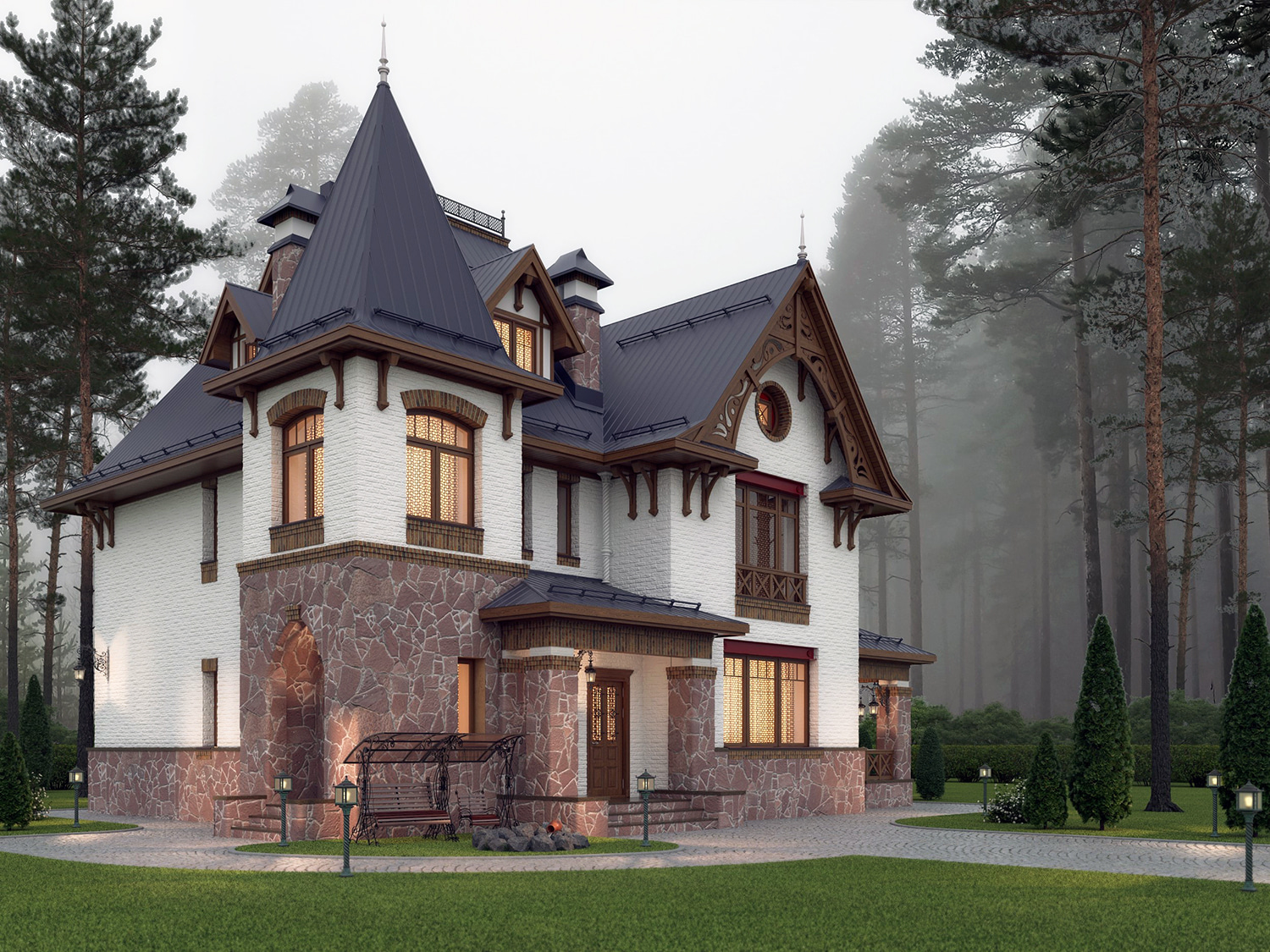 Особняк по мотивам первых петербургских домов в стиле a-la russe. В момент постройки таких дач на Каменном острове они были самыми современными и стильными домами на окраине имперской столицы. Сейчас мы их бережем как культурное наследие и ревностно сохраняем архитектурный облик. Этот дом может уверенно претендовать на то, чтобы войти в историю наравне с дачами Петровой или Гаусвальд. Мотивы неорусского стиля и раннего модерна, пропорции и детали