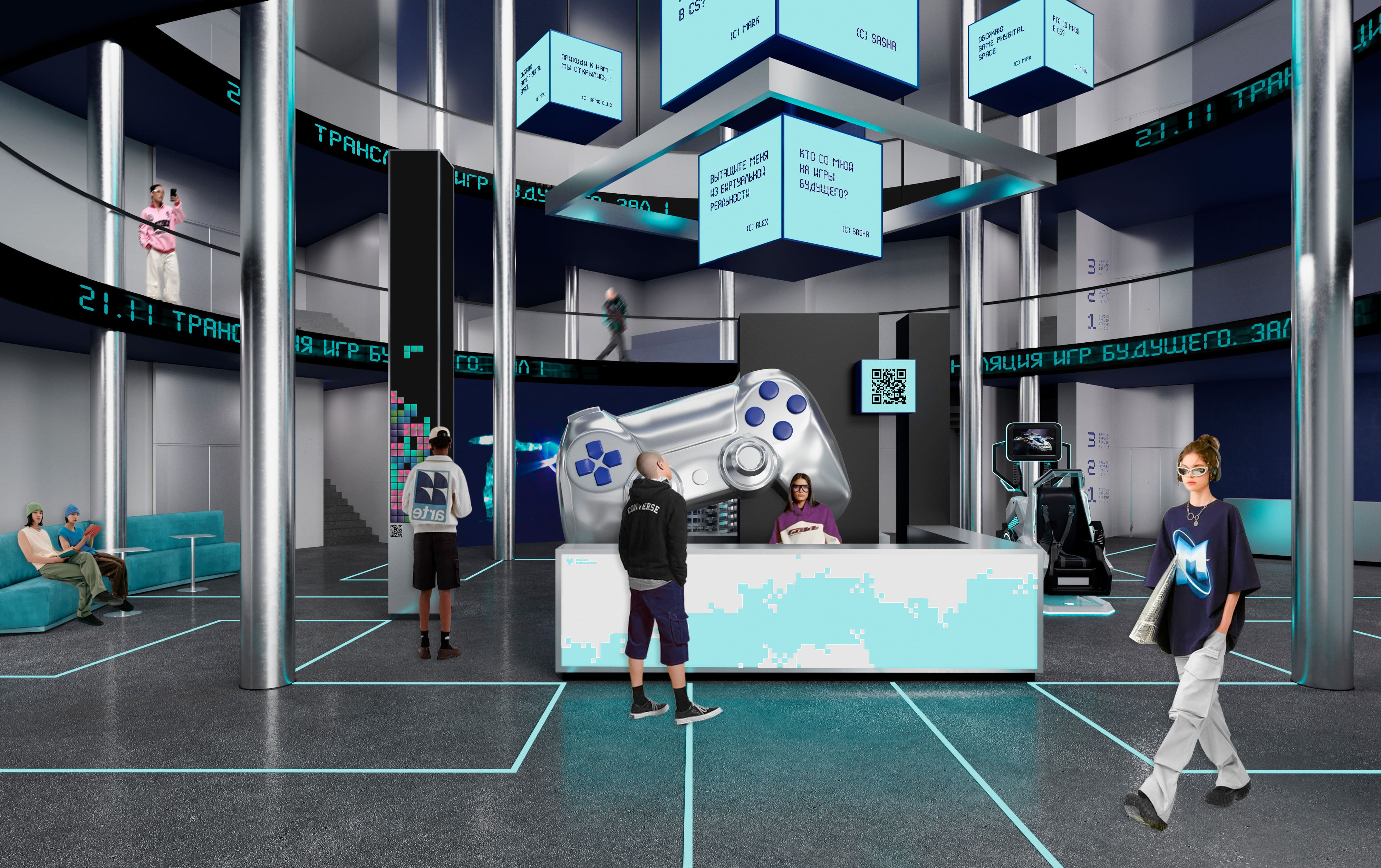 Описание проекта, предоставленное заявителем: Образовательно-развлекательное игровое пространство, где физическая и цифровая реальность сливаются благодаря интеграции технологий расширенной реальности (XR). Это инклюзивная игровая среда, где специалисты и потребители смогут системно взаимодействовать друг с другом, развивать продукты на стыке разных отраслей и обмениваться опытом. Задача состояла в том, чтобы превратить многоуровневое общественное здание в игровую вселенную, где каждый посетитель становится отдельным персонажем и перемещается в пространстве, словно по level-map, следуя от центра — «гнезда процессора компьютера» — за встроенными линейными светильниками на полу.