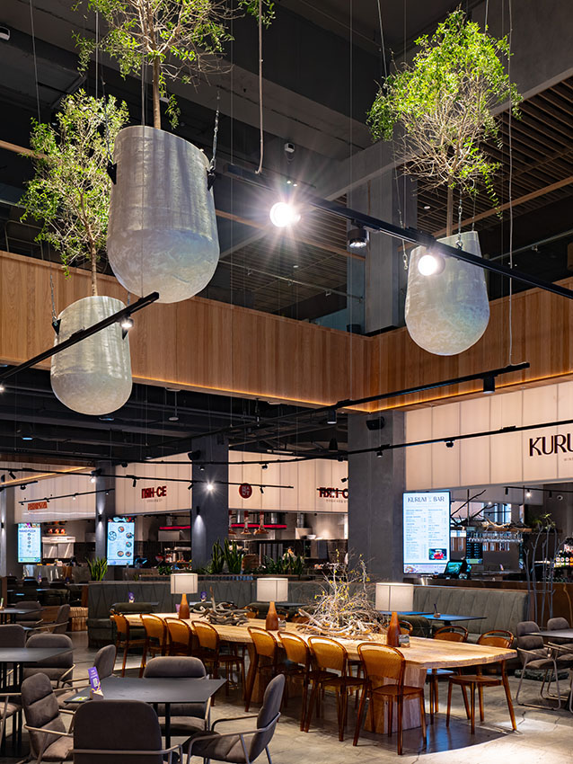 Мы сделали пространство, которое выглядит как ресторан, а не как фудкорт. Где нет излишнего шума и яркости. Где все объединено единой концепцией. И, несмотря на разнообразие кухни, соединяется в одну выдержанную линию.