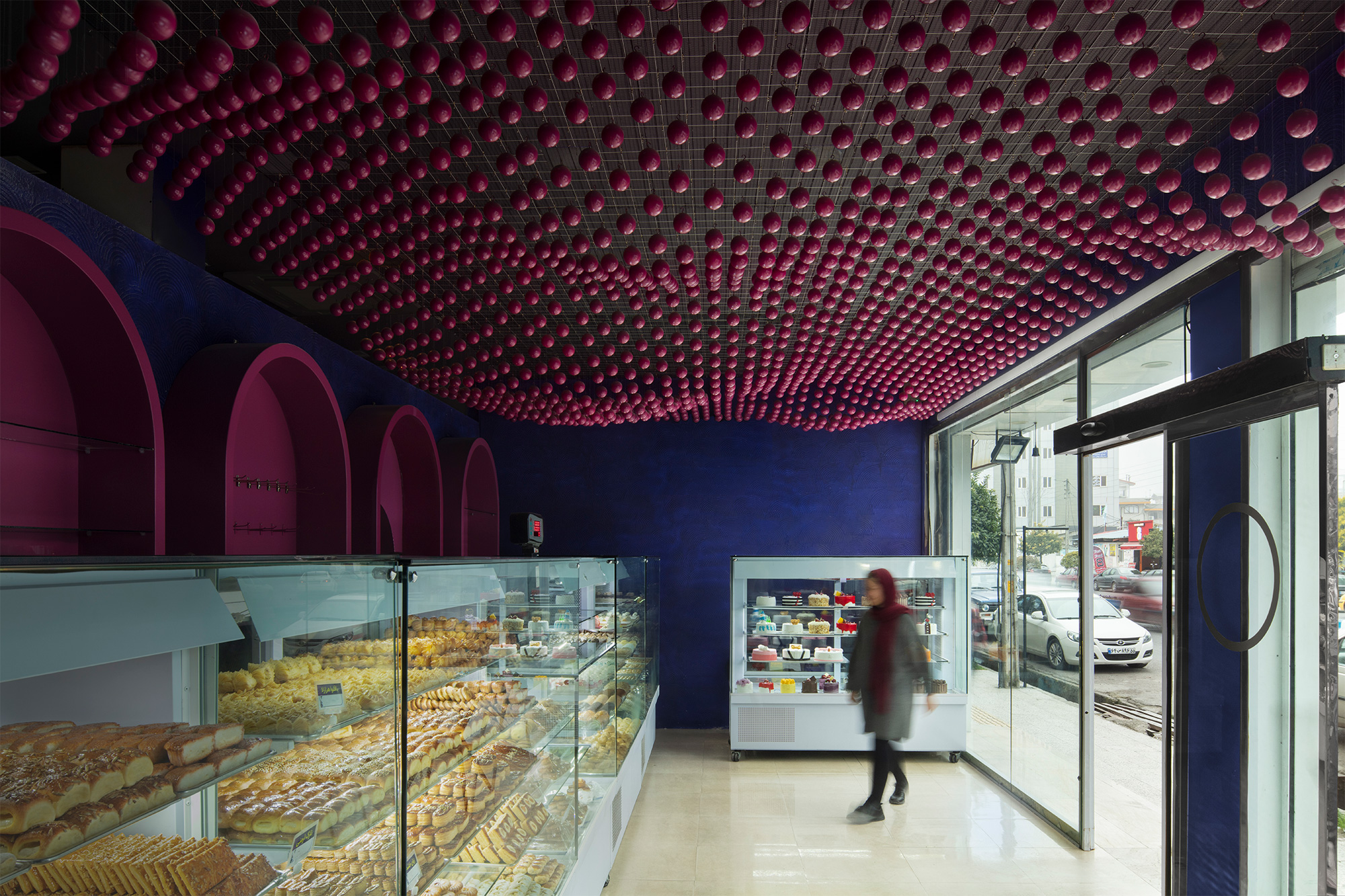 Описание проекта, предоставленное заявителем: Проект реализован на арендованном помещении стоимостью 200 миллионов томанов (без учёта изменений фасада и пола по просьбе владельца). Все элементы дизайна выполнены мобильными и адаптируемыми, создавая уникальный и привлекательный интерьер кондитерской. После изучения различных альтернатив было решено использовать недорогие материалы, соответствующие ограниченному бюджету. Центральным элементом стал материал «шары», учитывая особую форму потолка и визуальный акцент проекта. Цветные шары для бильярда, знакомые с детства, позволили создать живое, подвижное и изысканное пространство; 3000 шаров были приобретены по цене 2 400 000 томанов. Основные принципы дизайна — мобильность, яркость и утончённость.