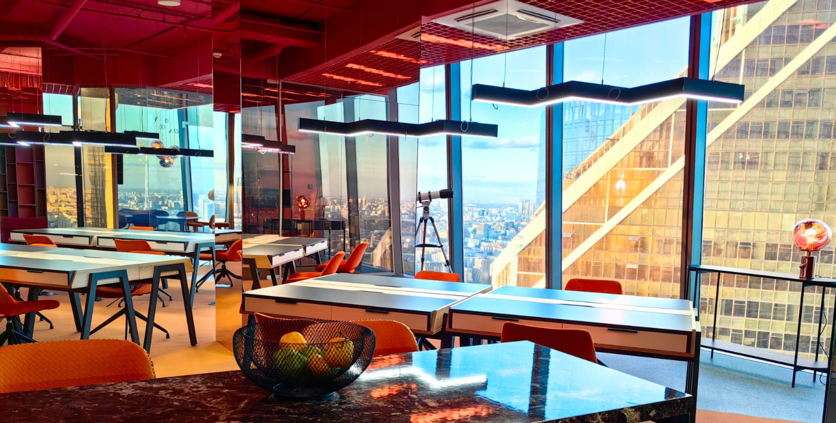 Описание проекта, предоставленное заявителем: Офисное пространство 150 кв.м на 71-м этаже башни "Федерация". Расположено в угловой секции с завораживающим видом на город и башню "Меркурий", который сразу дал название офису "Золотой угол". Золотые углы прослеживаются и во всём облике офиса: золотые зеркала "растворяют" массивные колонны внутри помещения. Золотые зеркальные треугольники на потолке в зоне кинотеатра прячут светильники и рассеивают свет, превращая его в подобие заката над "Меркурием".