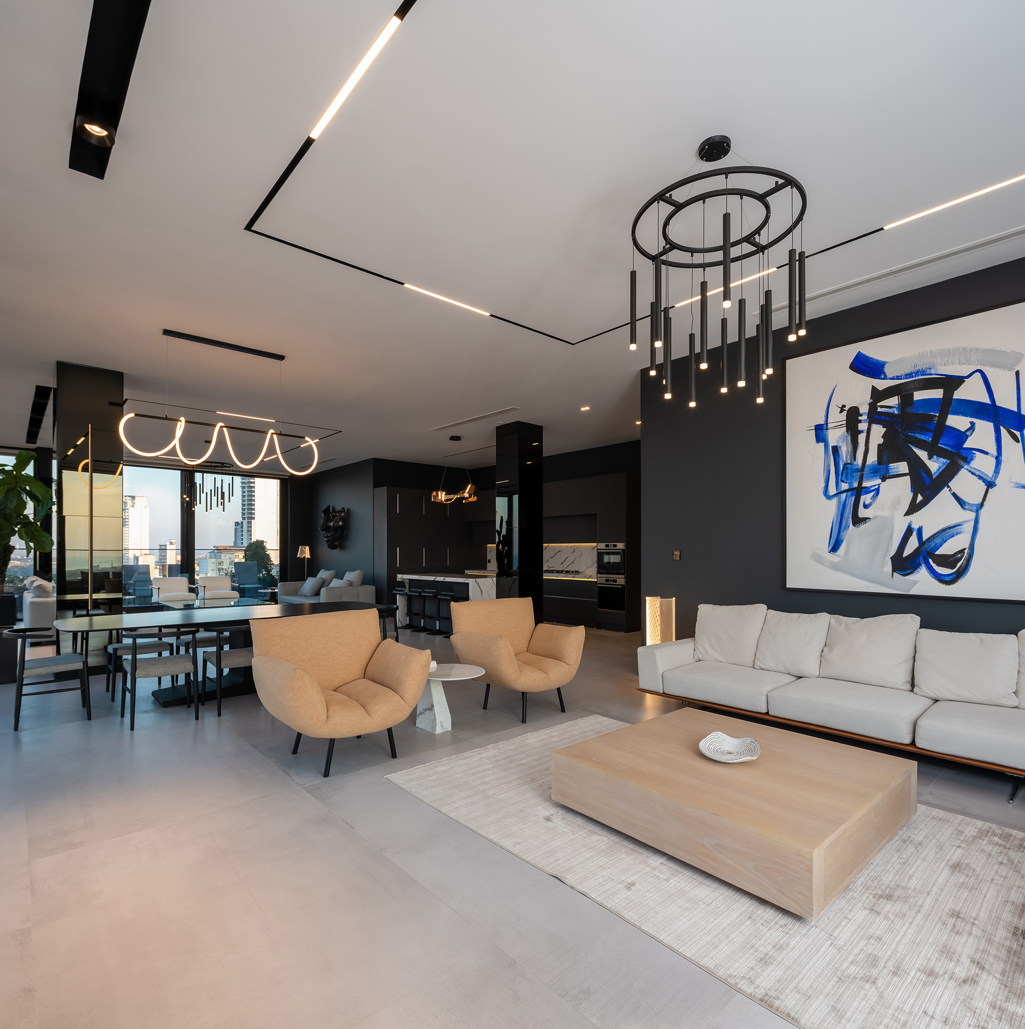 Площадь пентхауса составляет ни много ни мало 401 м². Когда заказчик обратился к дизайнерам, внутри были практически голые стены. Среди пожеланий было высказано использование сложных передовых систем, в частности - теплых полов и зонированного управления микроклиматом. Яркой особенностью проекта является панорамное остекление на северном фасаде - через эти окна в дом попадает достаточно солнечного света, который создает причудливую игру светотени в тщательно проработанных интерьерах. На широких террасах нашли свое место зона для барбекю, открытый камин, зона отдыха и даже гидромассажная ванна. Среди использованных материалов - керамическое напольное покрытие, затемненные зеркала, деревянные элементы и прозрачное остекление.