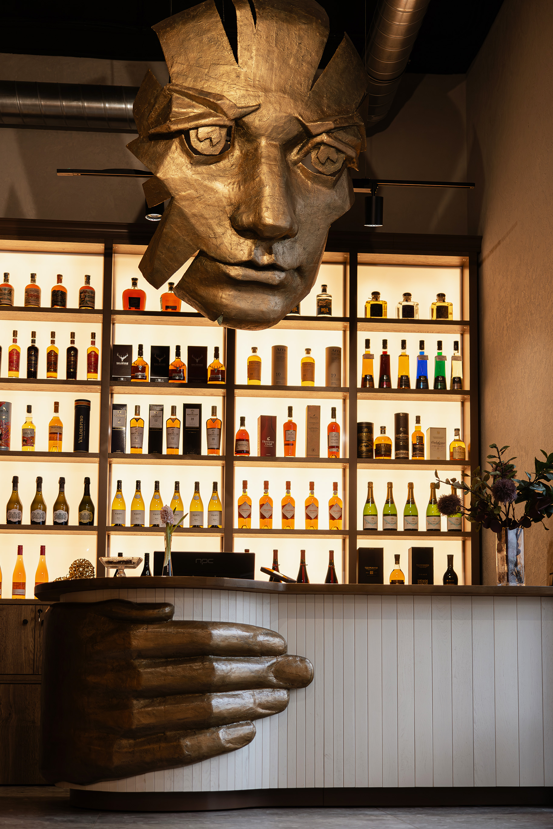 Центральный арт-объект над кассовой зоной – парящий образ духа – стал настоящим символом заведения. Его динамичная конструкция не просто украшает пространство, а словно приглашает каждого гостя остановиться, расслабиться и насладиться моментом. Этот величественный элемент воплощает саму суть магазина – утончённость и открытость для истинных ценителей. Скульптура создана из стекловолокна известным российским скульптором Юрой Мистрюковым.