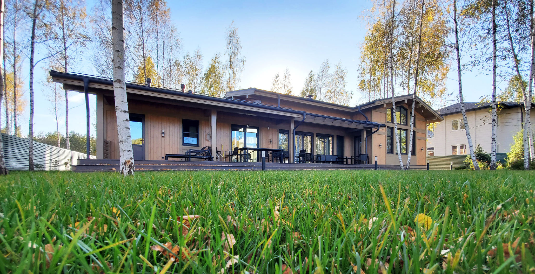 Дом построен из дерева по технологии NATURI, кровля фальцевая, окна деревянные. Фасад выполнен в натуральных оттенках дерева в сочетании с контрастными темно-серыми окнами и кровлей.