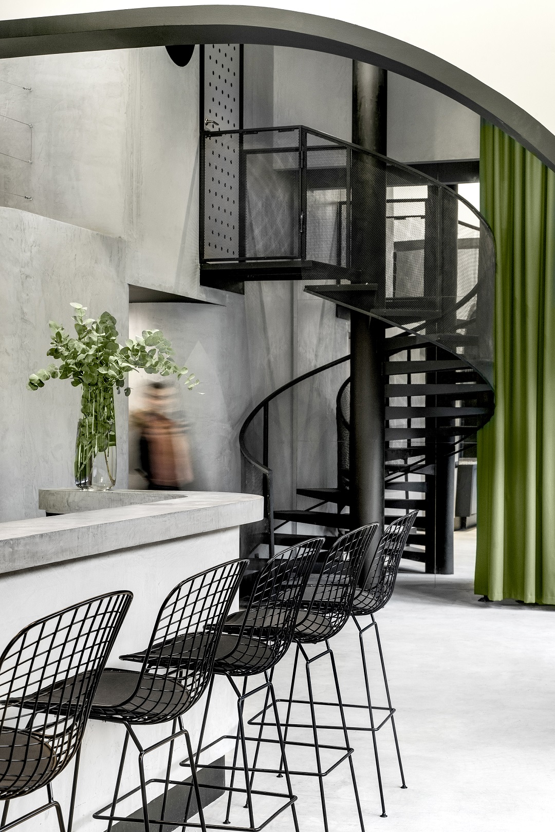 Изначальная площадь помещения (290 м2) не позволяла разместить столько зон. Решением этой проблемы стал антресольный этаж, благодаря которому удалось увеличить площадь до 340 м2. Выбор сдержанной палитры интерьера определил название event-пространства — Grey Green.