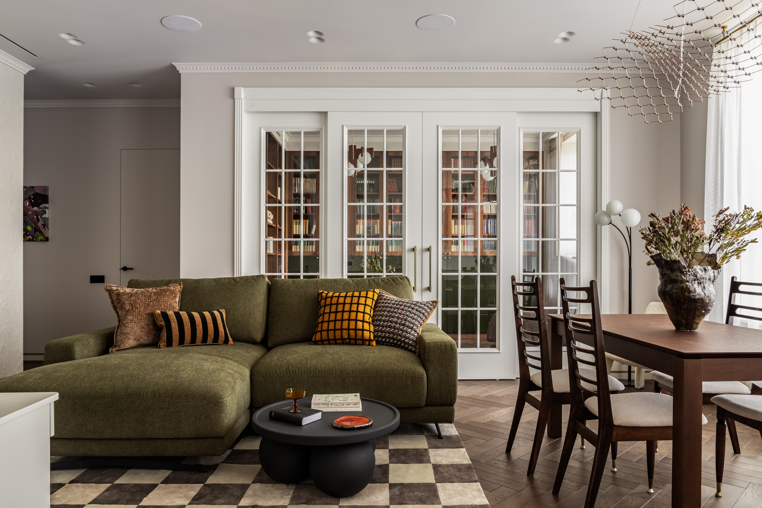 Описание проекта, предоставленное заявителем: Источником вдохновения для этого проекта стал любимый фильм заказчицы "Цвет граната". В нем собраны этнические мотивы Центральной Азии, "неидеальная идеальность" окружающего нас мира, утонченность форм и вместе с тем буйство красок. Словно из разных нитей памяти, нам удалось сплести в один красочный ковер воспоминания детства, путешествия юности и ритм современной жизни мегаполиса. Как и всегда, мы трепетно относимся к ценным семейным реликвиям, вещам с историей, которые по крупицам удается собрать по мере подготовки и реализации проекта. Мы реставрируем, привозим и восстанавливаем предметы, которые будут на протяжении долгой жизни служить маркерами памяти для наших заказчиков. Так у нас получился проект о большом и очень добром сердце.