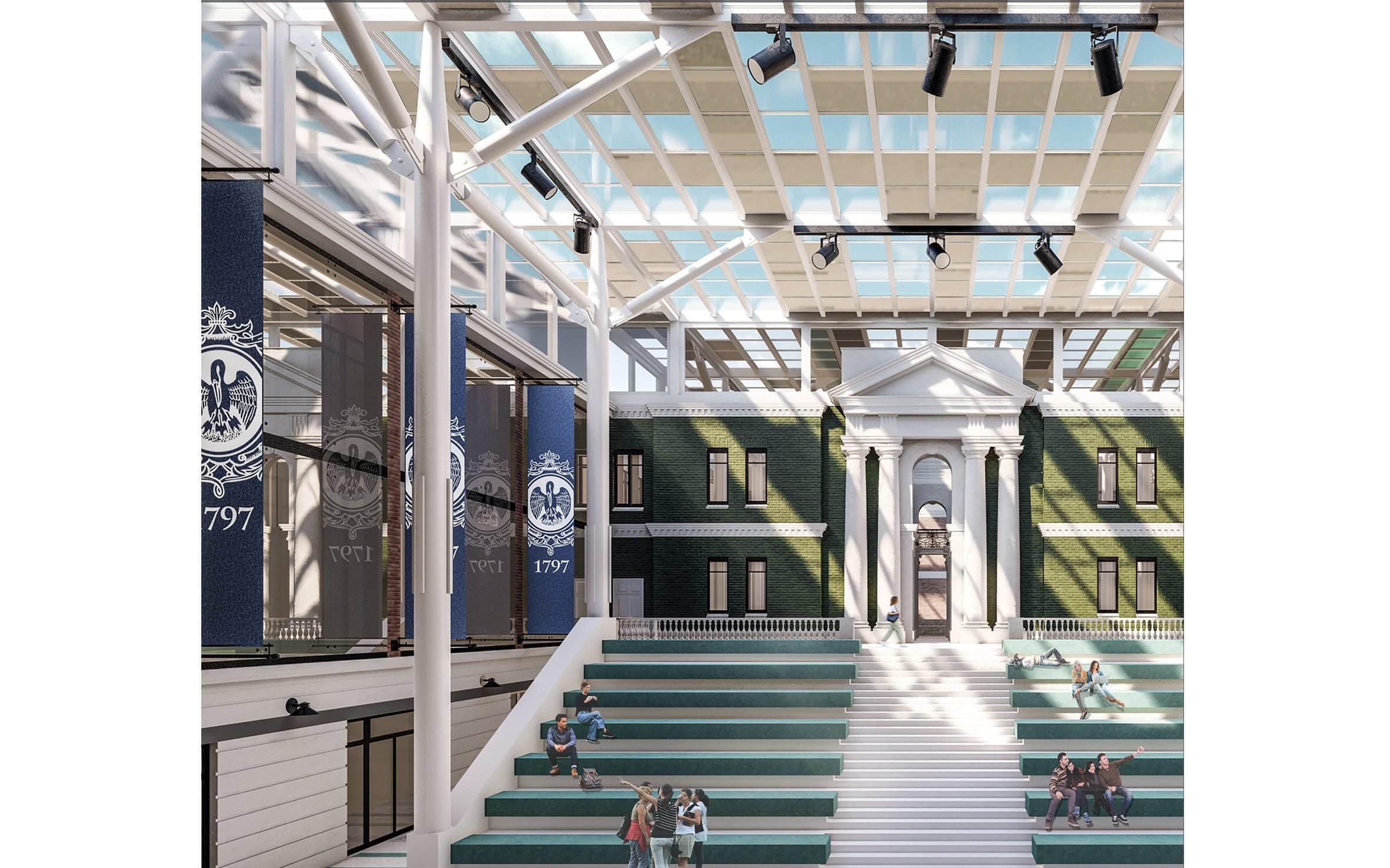 На данный момент у факультета нет общего пространства для проведения массовых мероприятий. Необходимые пространства можно организовать в двух дворах, накрыв их стеклянным куполом и создав место, где можно проводить лекции, симпозиумы и т.д. В большом дворе здания располагается великолепная колоннада с четырьмя колоннами, которые расположены на террасе второго этажа здания. Именно эта колоннада является входом в тихую зону и аудиториям. Атриум, в который мы проходим через проход, отличается ярким и современным дизайном, и уже оттуда мы увидим другую колоннаду, с квадратными колоннами.