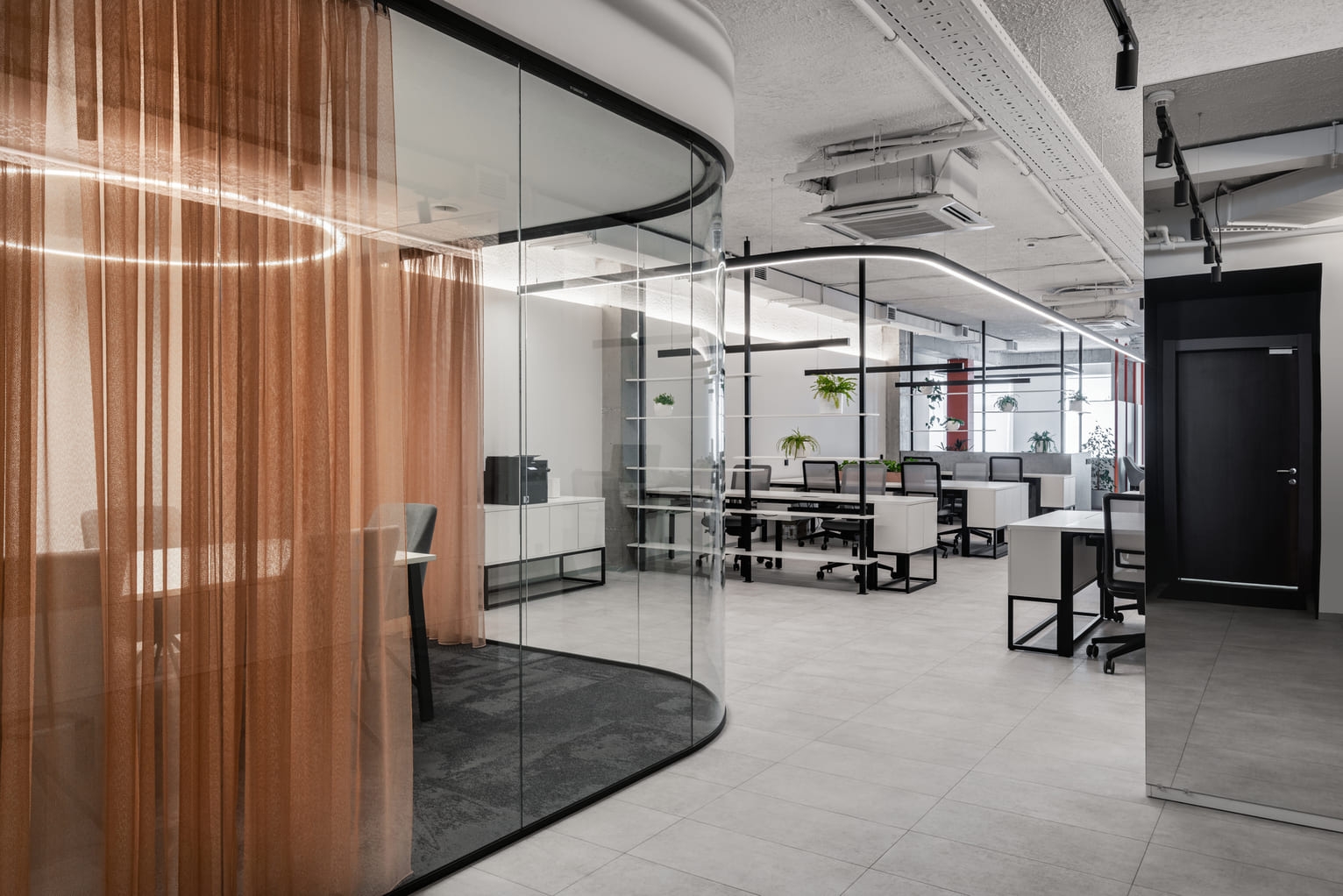 Закругленные кашпо кораллового цвета выполнены по индивидуальному эскизу и служат разделителями рабочих зон.