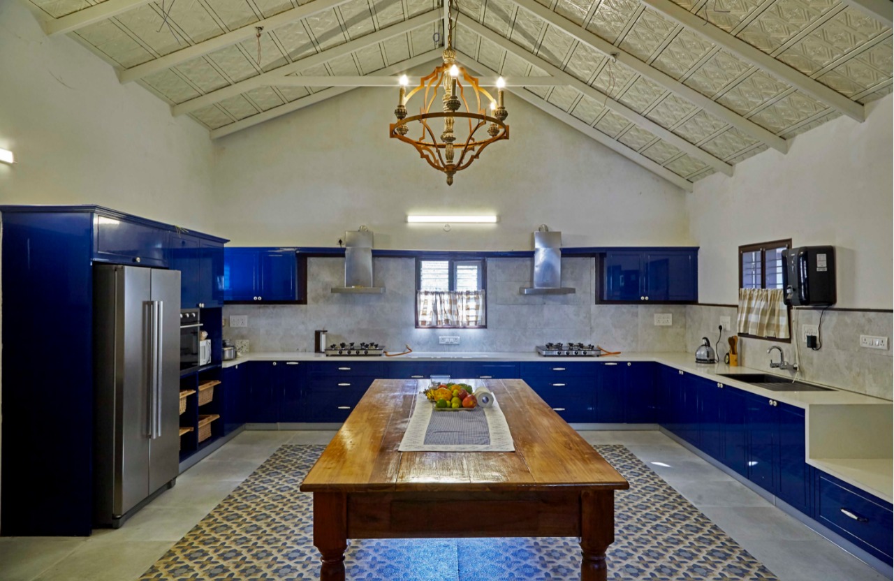 Проект кухни для дома в английском колониальном стиле, стилизованного под бунгало при кофейной плантации. Для организации необычно просторной кухни были использованы простые и в то же время люксовые решения. Цветовая палитра представлена яркими оттенками, которые выгодно оттеняют традиционную кухню в викторианском стиле. Здесь есть вся бытовая техника, необходимая на современной кухне. Деревянный стол изготовлен вручную и делает интерьер еще более аутентичным. Напольное покрытие выполнено из плитки двух типов.