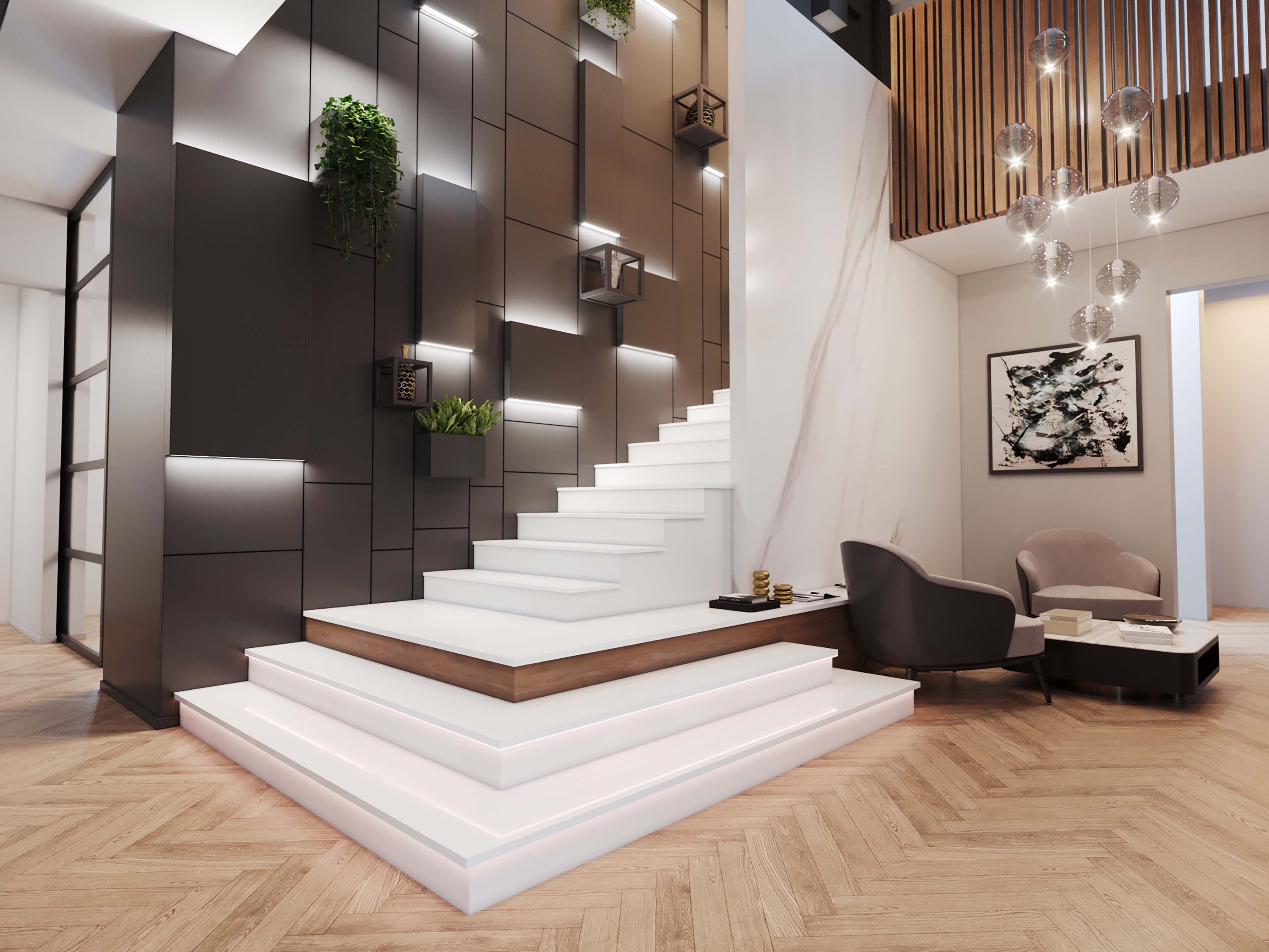 О проекте: Работы по дизайну интерьера проведены в двухэтажном доме общей площадью около 380 кв.м. Проект предусматривал создание единого пространства на первом этаже с необходимым бесстеновым зонированием. Двусветное пространство холла соединяет первый этаж со спальней. На входе в дом хозяев и гостей встречает стена из белого мрамора Calacatta и сложная конструкция из металлических и магнитных элементов.