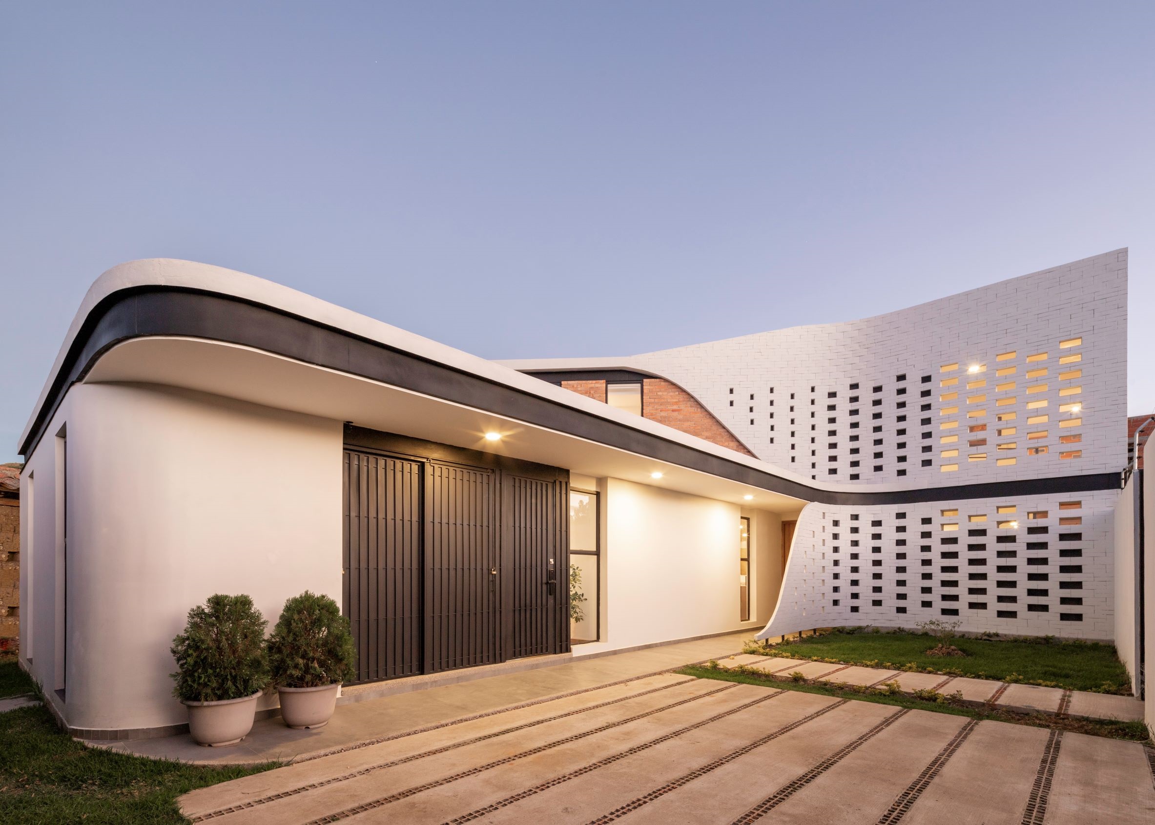 О проекте: В основе проектной концепция лежат довольно простые принципы: 1) изогнутые линии, использованные для создания контуров обоих объемов дома; 2) кирпичная кладка со сквозным узором на фасадах; 3) размер и структура кирпичей; 4) стальное армирование кирпичной кладки; 5) использование поперечной вентиляции; 6) ориентация фасадов на восток и на запад для обеспечения комфортной температуры в помещениях, оптимальной инсоляции и игры светотени.