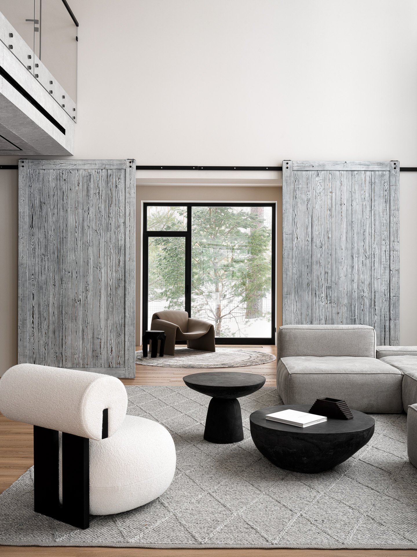 Стояла задача сделать светлое, современное пространство с большим количеством воздуха и естественного света, используя при этом природные материалы - бетон, стекло и натуральное дерево. В гостиной использован интересный прием: в ее пространство сверху будто бы врезан монументальный объект из бетона. Таким хитрым образом в интерьер вписали перекрытие между первым и вторым этажом.