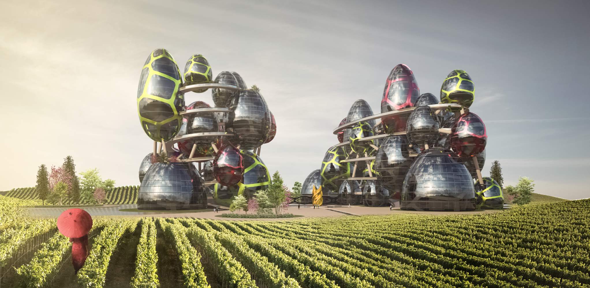 Для изготовления вина используется виноград разных форм и цветов, а старинные бродильные чаны, все еще применяемые для выдержки вин, схожи с ними своей формой. Блестящие и матовые виноградины контрастируют с чанами, традиционно изготавливаемыми из глины. В своем проекте авторы используют эти образы и рассчитывают сохранить этот контраст за счет использования разнообразных материалов.