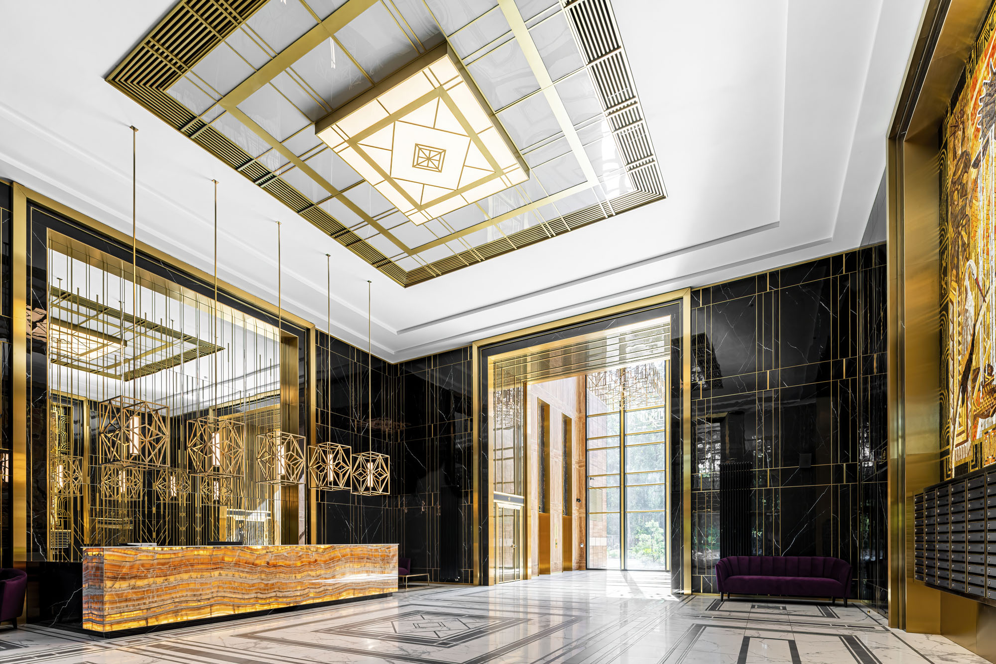 Световые и фактурные эффекты в сочетании с острым блеском металла доведены в вестибюле жилого дома «Институтский, 16» до предельной выразительности. Характерное для интерьеров эпохи ар-деко сочетание зеркальных и полированных поверхностей в современном здании воплощается в обширном остеклении, ажурных светильниках и «электрических разрядах» золотистого профиля. Игру линий и отражений в оформлении продолжают тёплый оникс и панели из керамогранита с насыщенной текстурой песочного травертина и чёрного мрамора.