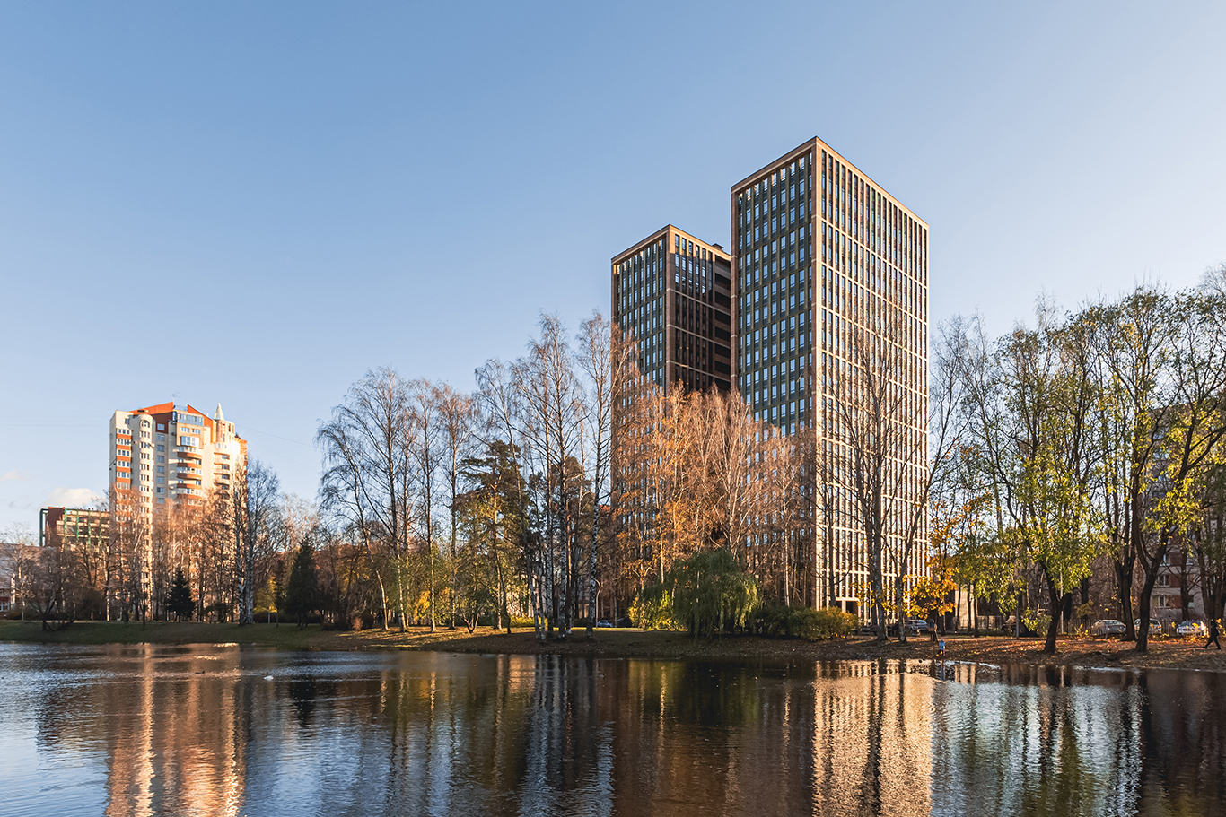 20-этажный, П-образный в плане жилой дом расположен в северном районе Петербурга, в окружении четырех парков и с видом на Серебряный пруд.