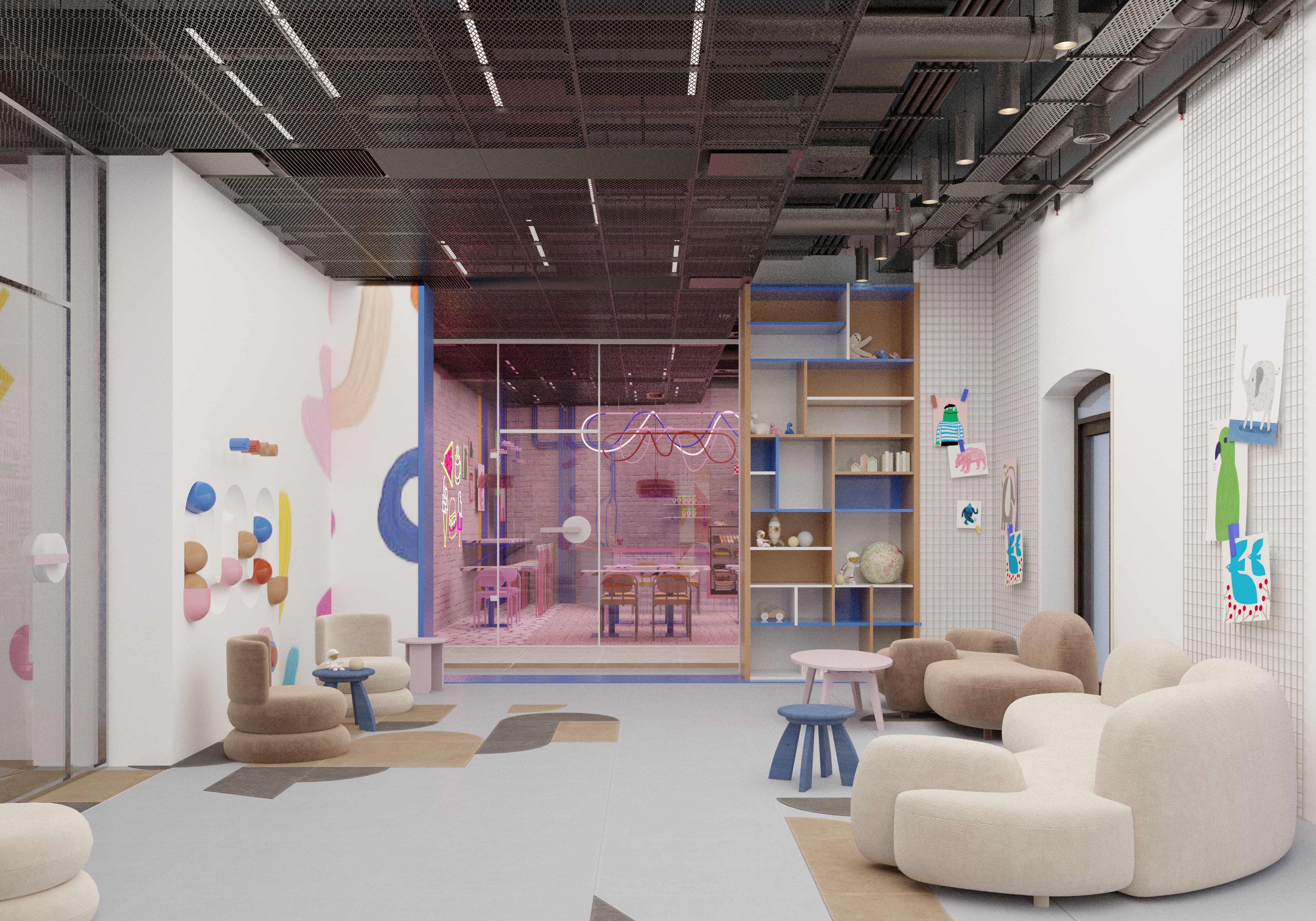 В интерьер внедрены развлекательные и развивающие элементы, такие как игры, шахматные доски, доски для рисования и сетки с рисунками. В работе использованы светлые, яркие тона, а также один из ключевых элементов колористики - контраст, который был достигнут за счет использования цветных изображений и граффити на стенах, сочетающихся с нейтральными оттенками мебели и текстиля.