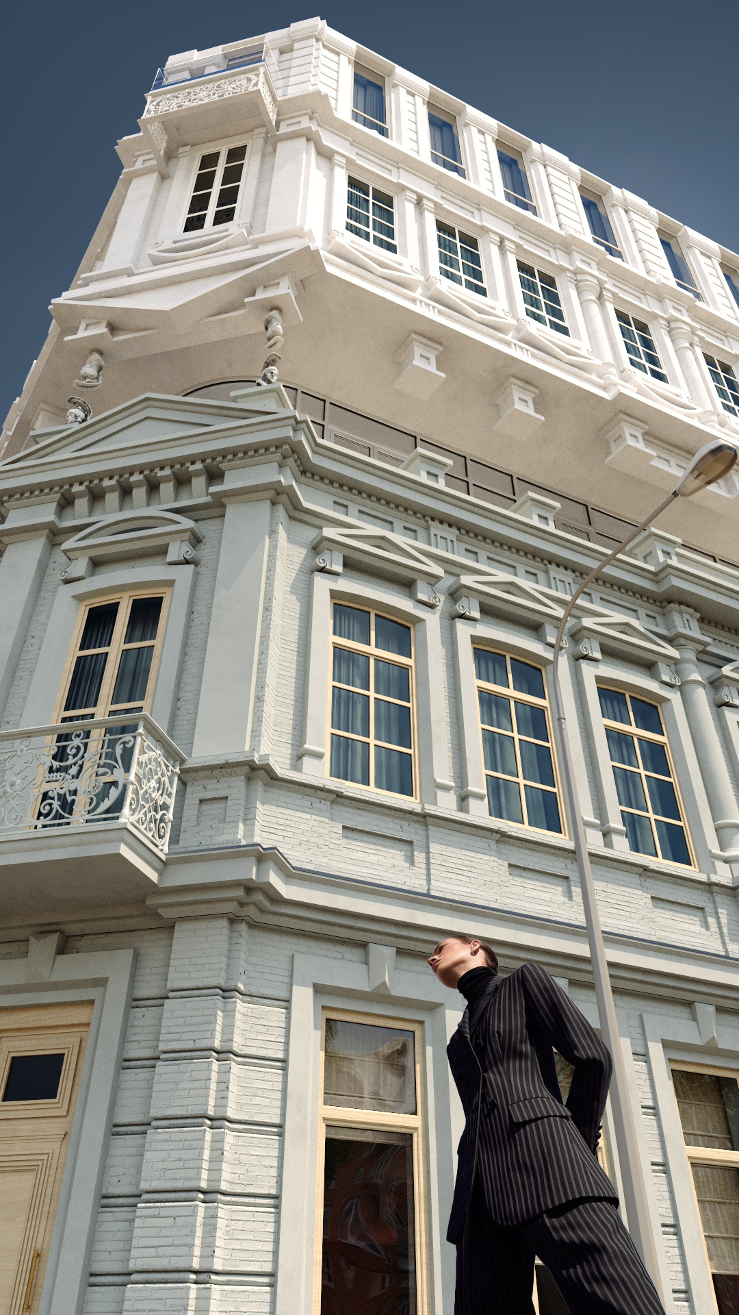 Нижняя часть фасада материальна - выполнена в открытой кладке с декоративным швом с последующей покраской в английский серый. Дубовые рамы и двери, кованый балкон придают материальности. Инверсия же его нарочита абстрактна - в штукатурке и белом цвете. Этаж, разделяющий эти фасады, - нейтрально стеклянный, с чуть задавленным витражом, для достижения более динамичного и яркого визуального эффекта.