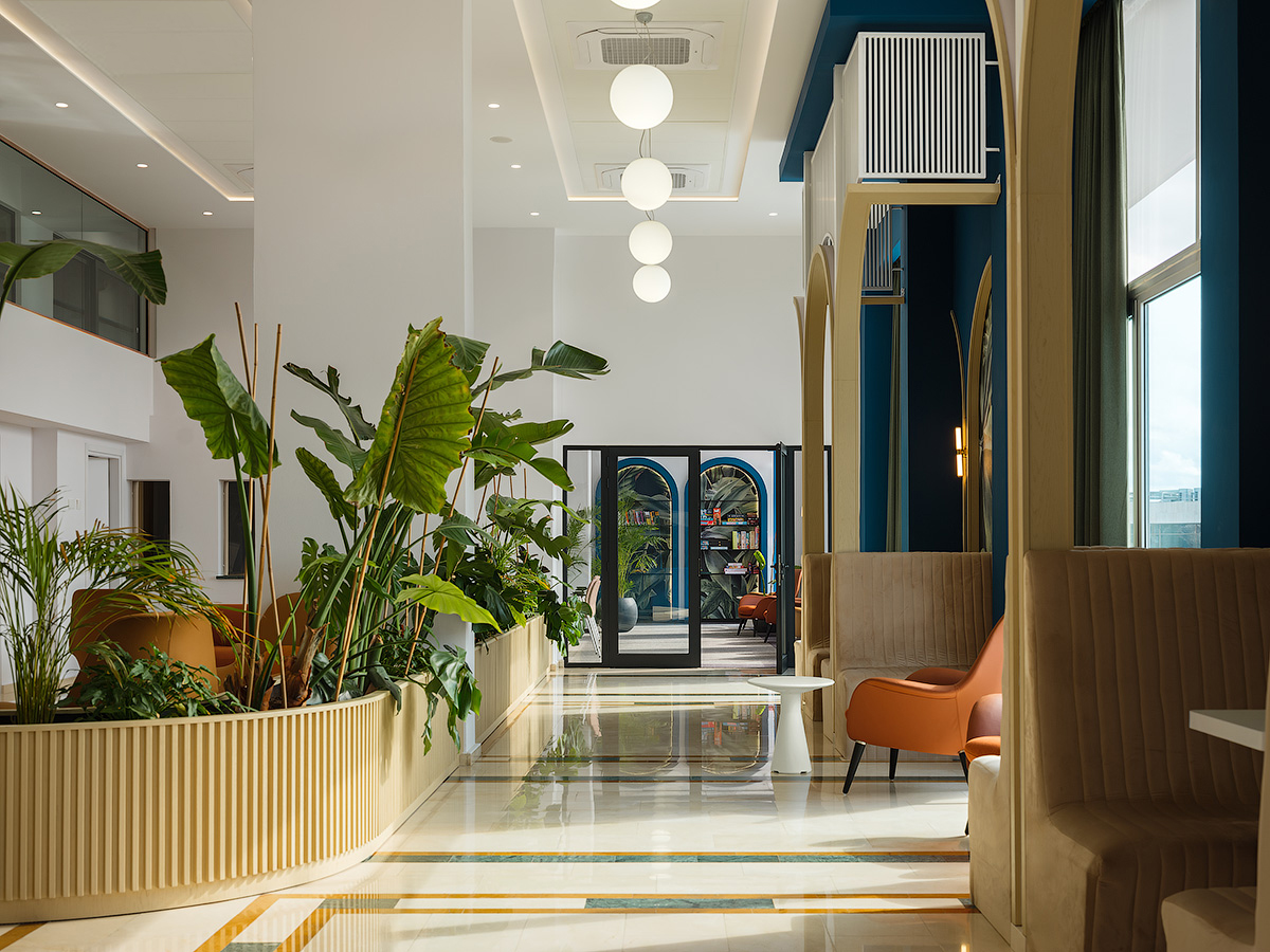 Ведущая международная компания на Кипре, разрабатывающая инструменты для программистов, известна высокой производительностью и инновациями. Для нового офиса требовалось пространство, отражающее эти ценности и способствующее развитию. Архитекторы AQ адаптировали здание бывшего отеля 90-х, сохранив коридорную систему и переосмыслив общественные зоны. Верхние этажи стали рабочими зонами с видом на море и кофе-пойнтами. Нулевой уровень включает летнюю террасу с кафе и бассейном, переговорные и столовую в средиземноморском стиле. Первый этаж оборудован ресепшн, лаунжем и мультифункциональным залом с мобильной мебелью и проектором. Дизайн вдохновлен кипрской архитектурой с белыми фасадами и тропическими акцентами; яркое решение — санузлы с тропическими мотивами. Фасад обновлен с элементами фирменного стиля, отражая дух инноваций.